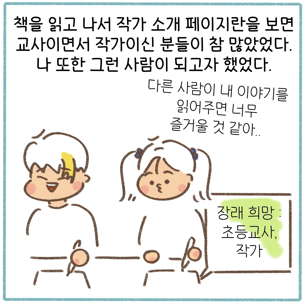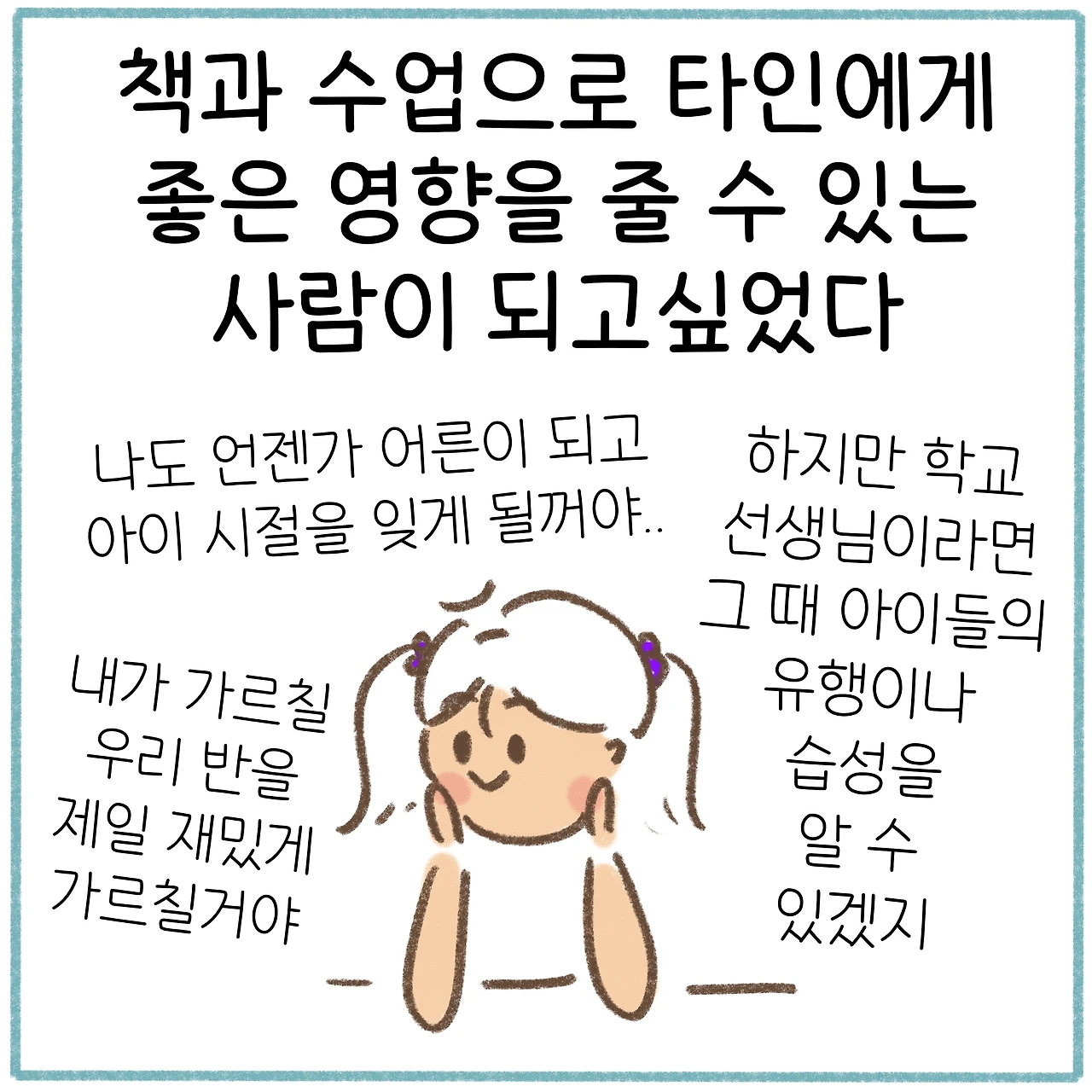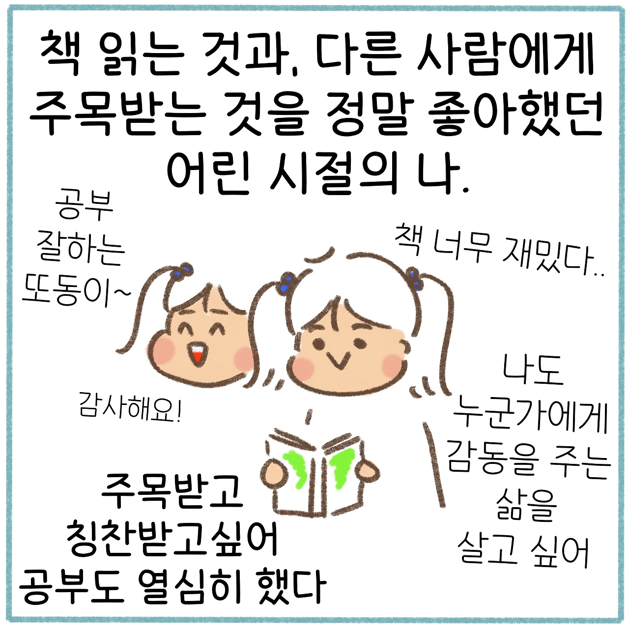 현재 내 진로 고민에 대한 생각을 풀어내려면 어릴 적 처음 꿈이란 것을 꾸기 시작할 때부터의 생각을 담아야 한다는 생각이 들었다. 책을 읽기 시작할 때부터 작가가 되어야겠다는 마음을 품게 되었다. 글을 쓰고 생각을 나누고자 하는 욕망은 나에게 사뭇 진지한 고민이었다.