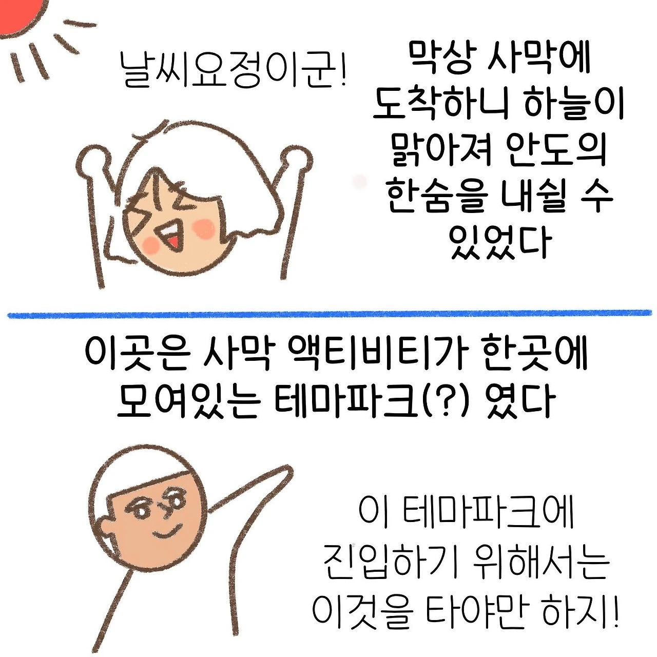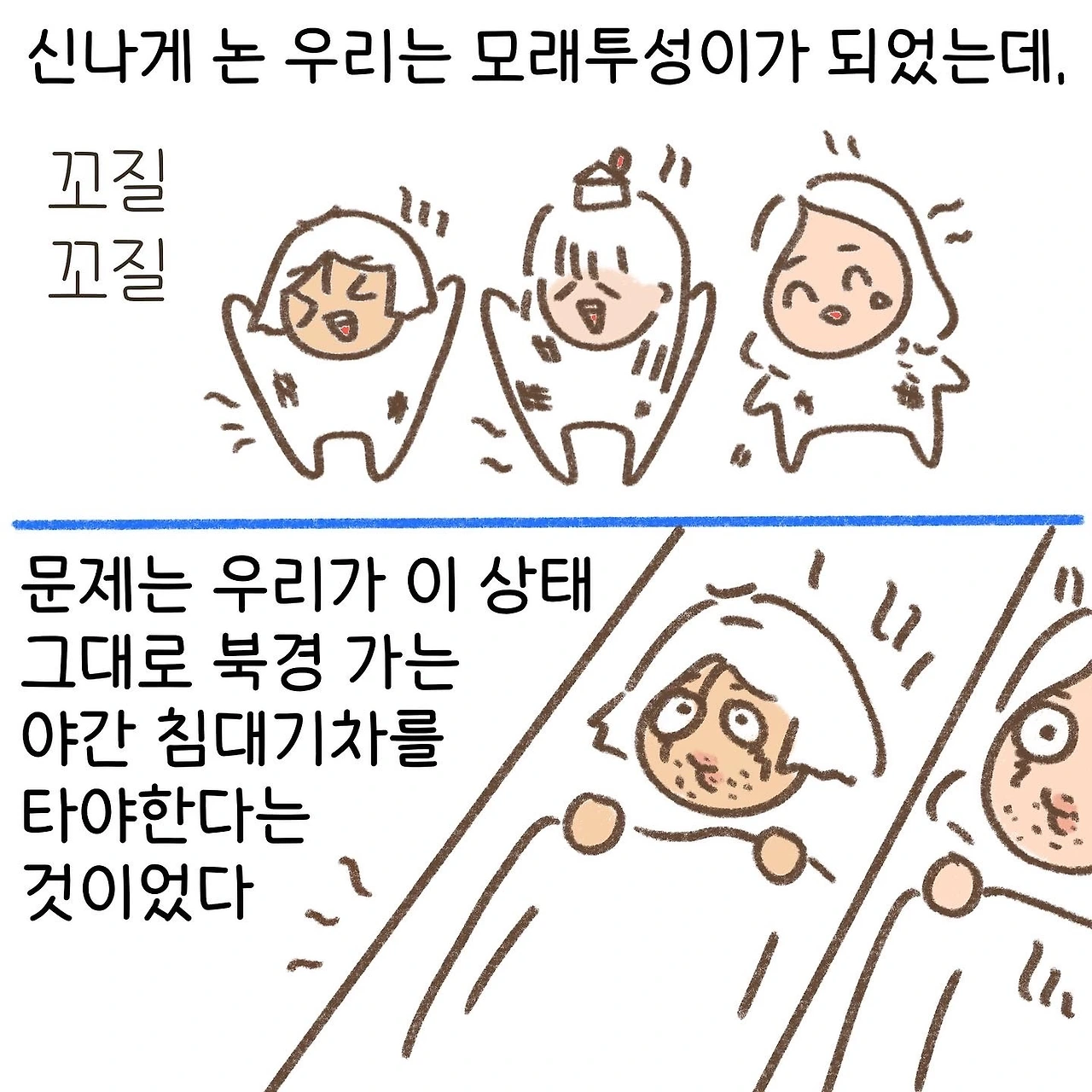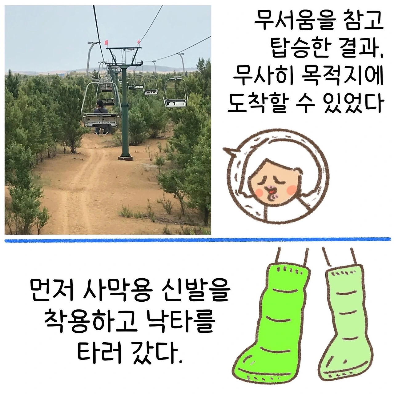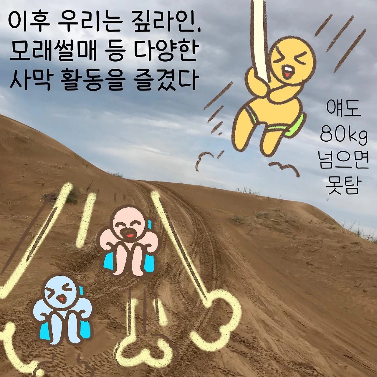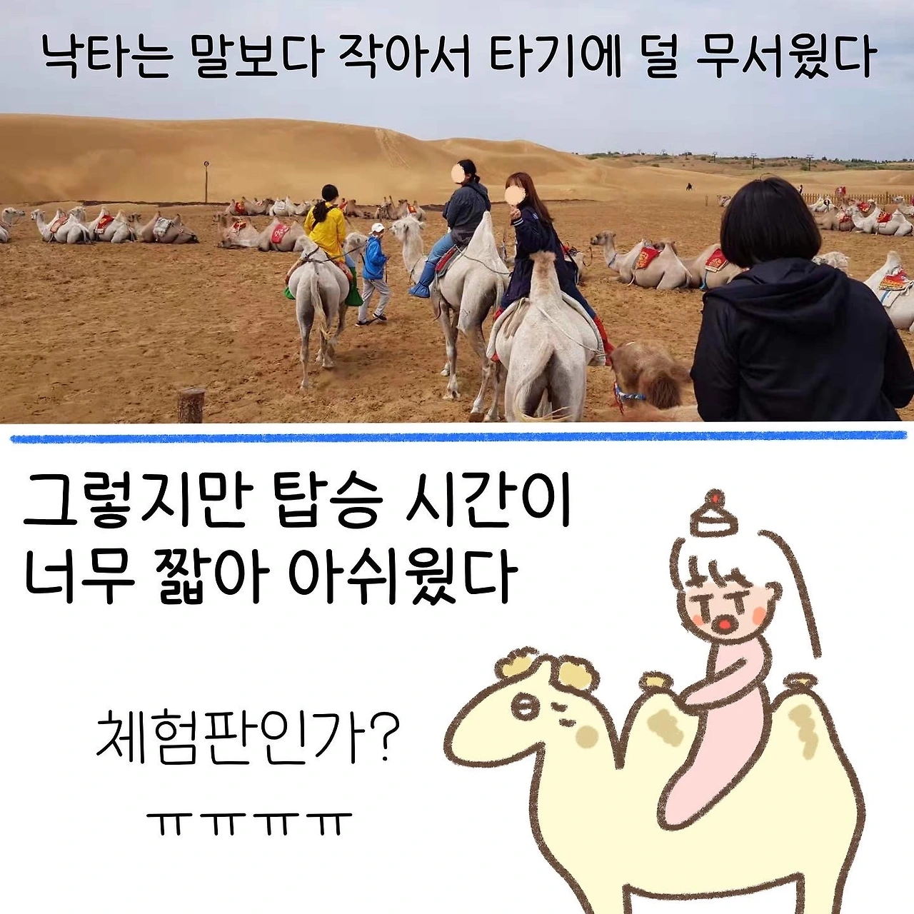 공포스러운 중국 케이블카를 많이 마주했다고 생각했지만 그중에서도 이곳의 케이블카가 제일 무섭게 다가왔다. 돌아오는 길에는 트럭 뒷자리에 실려 돌아왔는데, 이 편이 훨씬 재밌고 스릴 있게 느껴졌다. 몽골에서도 즐기지 못했던 사막 액티비티를 이곳에서 즐길 수 있었다. 미련이 남지 않을 정도로 즐겁게 놀았던 이 시간을 뒤로하고, 꼬질꼬질해진 우리는 그대로 북경행 침대 기차에 몸을 실었다.