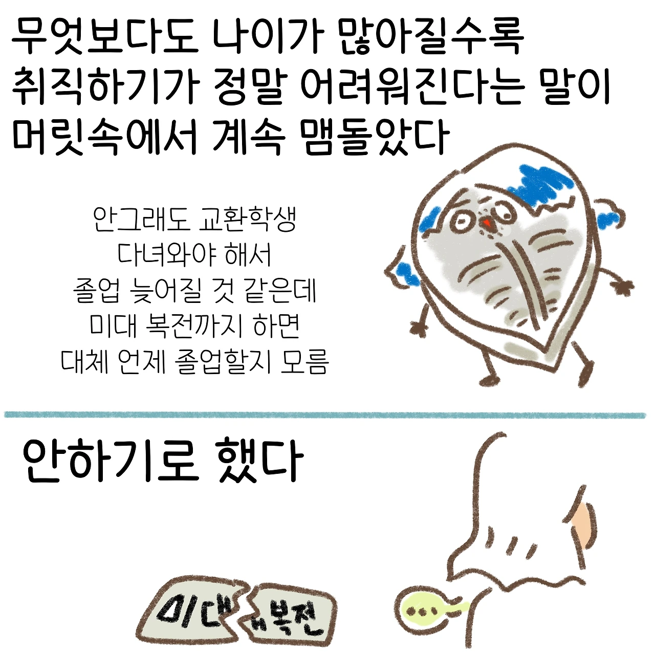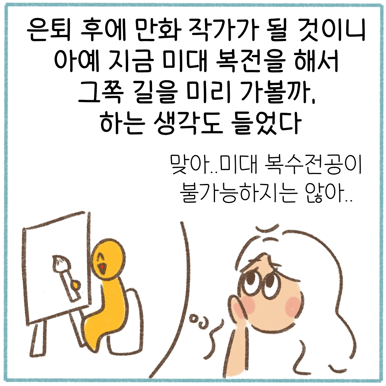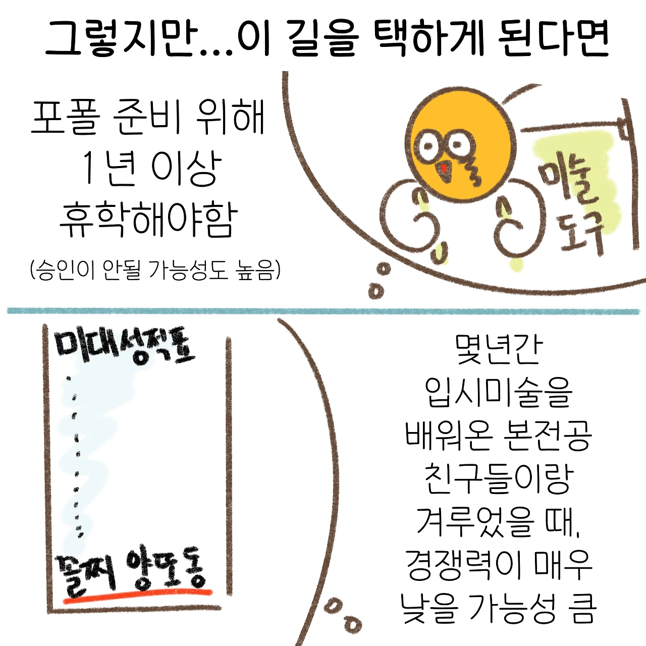 저 당시 미대 복수전공을 하지 않았음에 대한 후회가 지금의 나를 만들었다고 할 수 있겠다. 하고자 하는 바를 외면하게 된 대가를 이후에 혹독하게 치르게 되었고, 다시는 이와 같은 실수를 반복하지 않으리라 다짐하게 되었다.