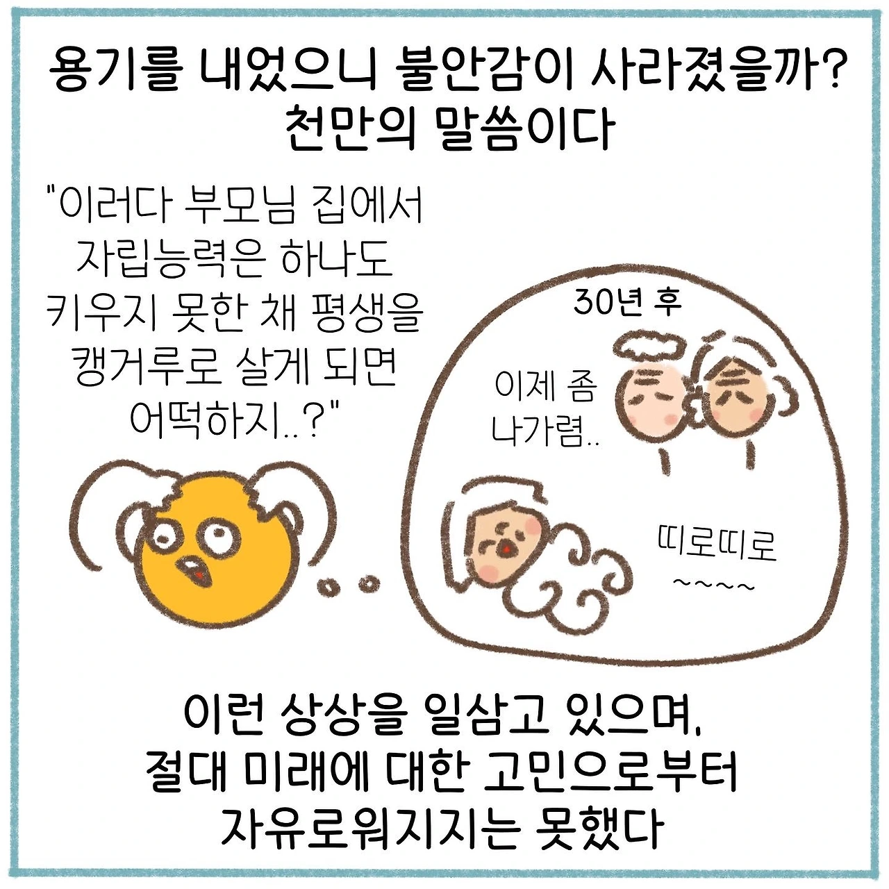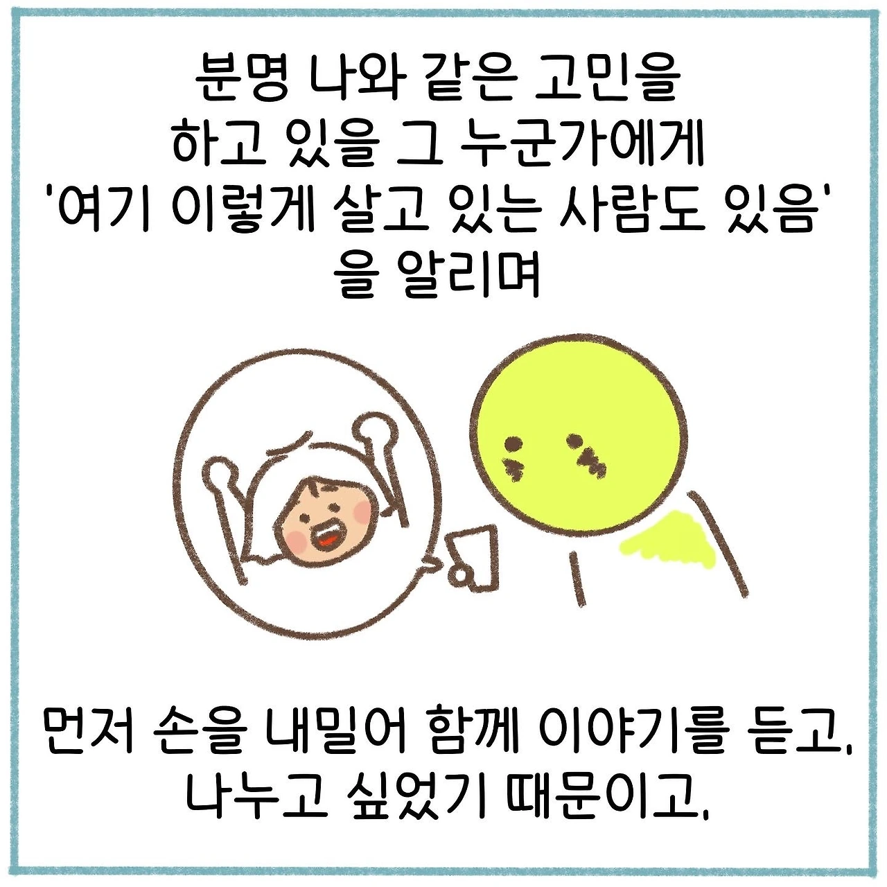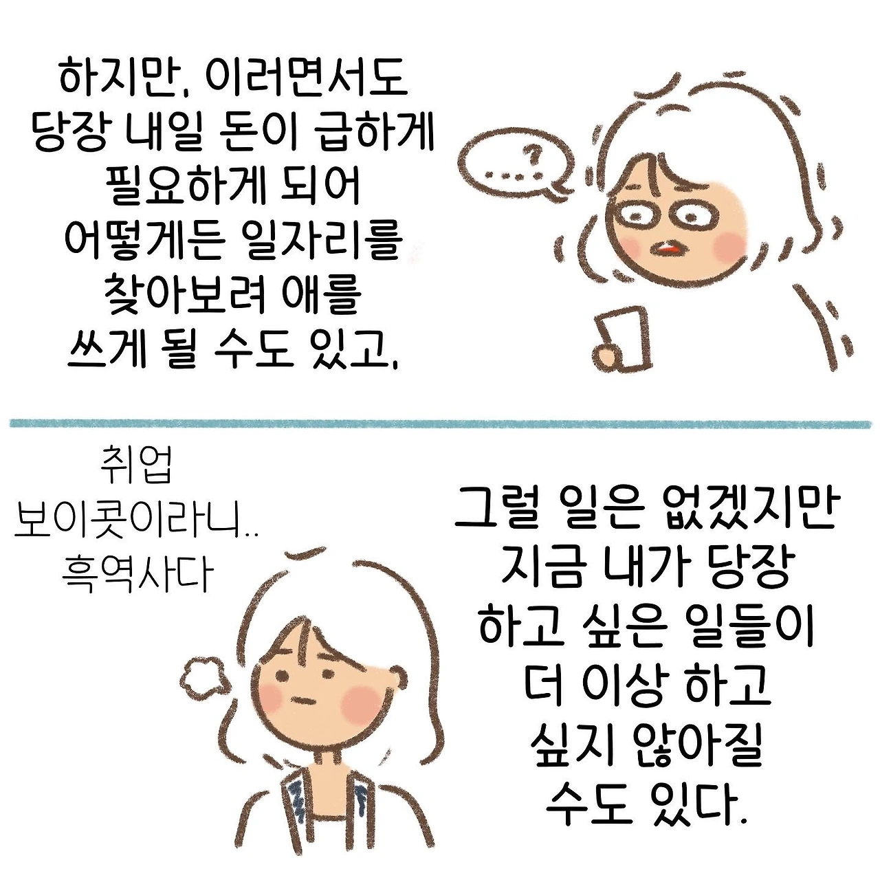 이 세상에 이런 방식으로 삶을 살아가는 사람 또한 있음을 알리고, 단절되기 쉬운 우리네 동년배들과 이렇게라도 연결되고 싶은 마음에 만화를 그리게 되었다. 인스타그램에 이 만화를 그려 올리며 수많은 지지와 응원의 메시지를 받을 수 있었고, 내 마음이 만화로 잘 전해졌음에 잔잔한 기쁨을 느꼈다.