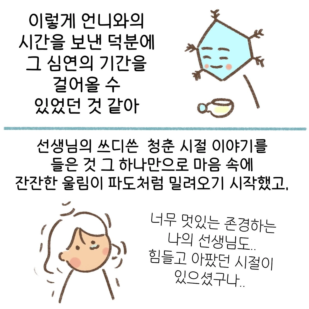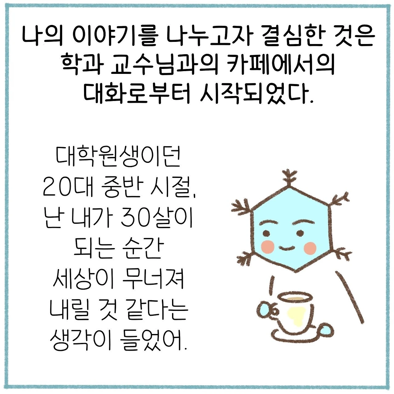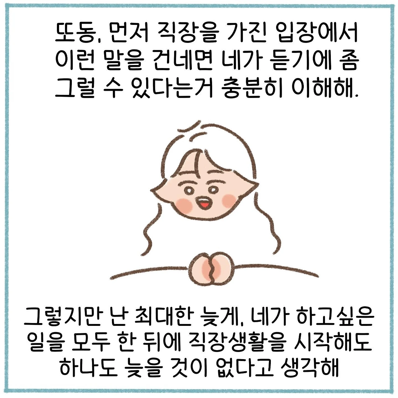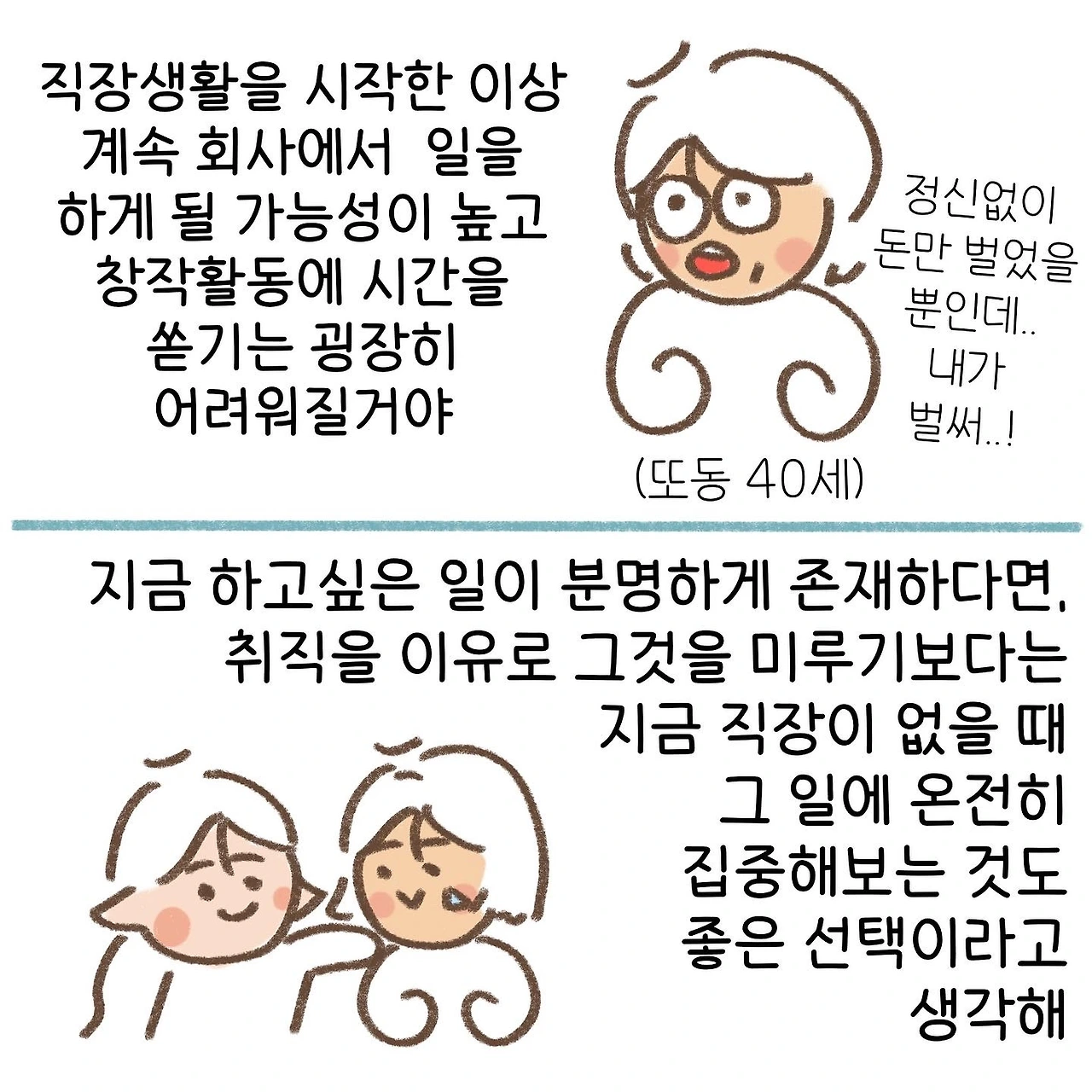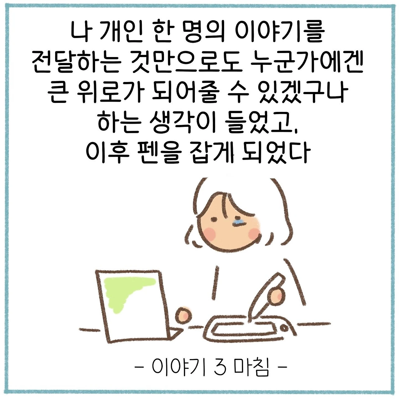 먼저 그 길을 걸어간 사람들의 이야기를 듣는 것만으로도 깊은 생각을 할 수 있게 되고, 이 생각들은 높은 확률로 결심이나 전환점이 되곤 한다. 그리하여 나는 더더욱 내 이야기를 공유하고, 퍼뜨리고자 한다. 이 이야기를 인스타그램에 먼저 연재하는 동안 이야기를 연재해주어 고맙다는 수많은 댓글들을 만나게 되었고, 내 생각이 틀리지 않았음을 알게 되었다. 부디 나의 이러한 결심에 대한 생각이 시간이 흘러도 변하지 않길 바랄 따름이다.