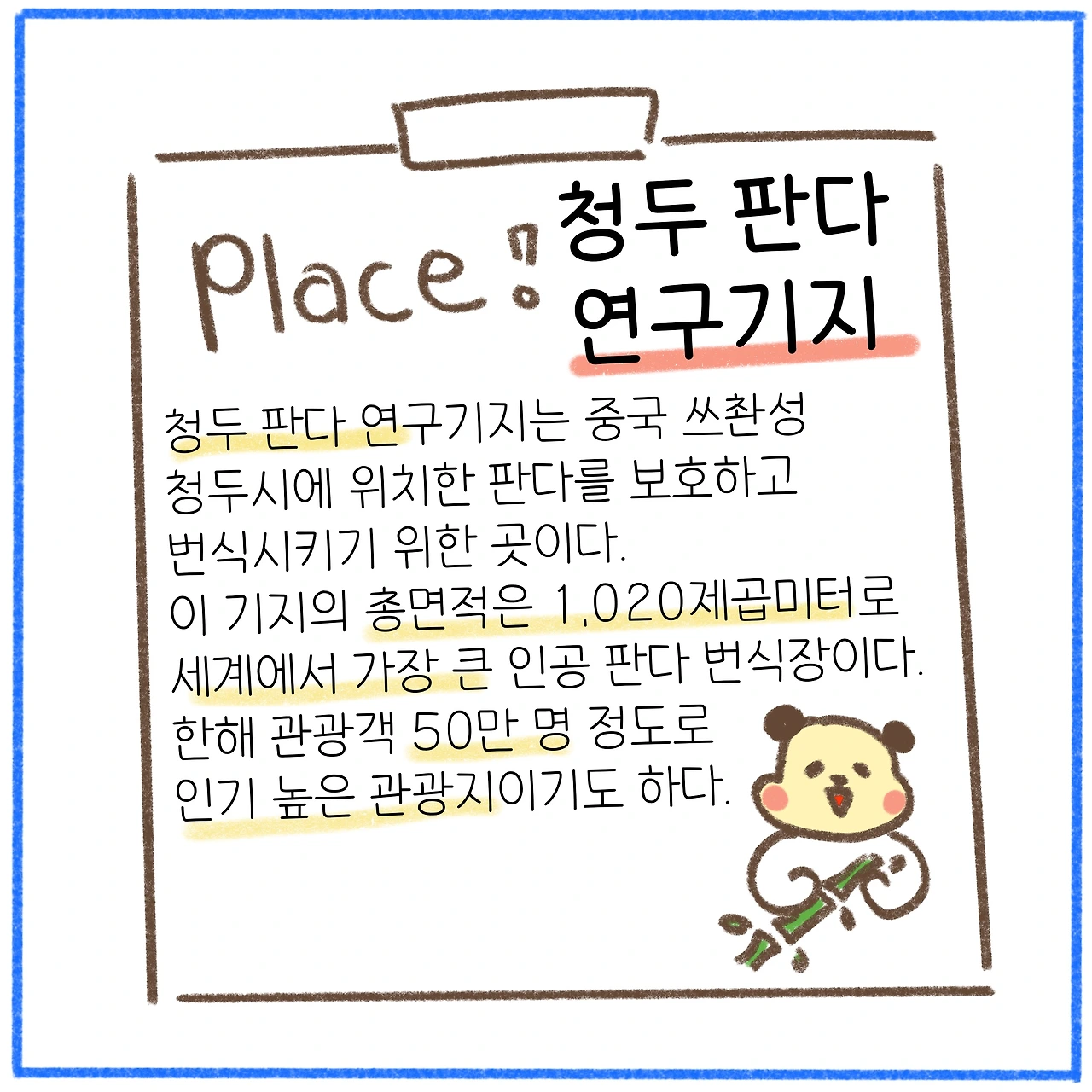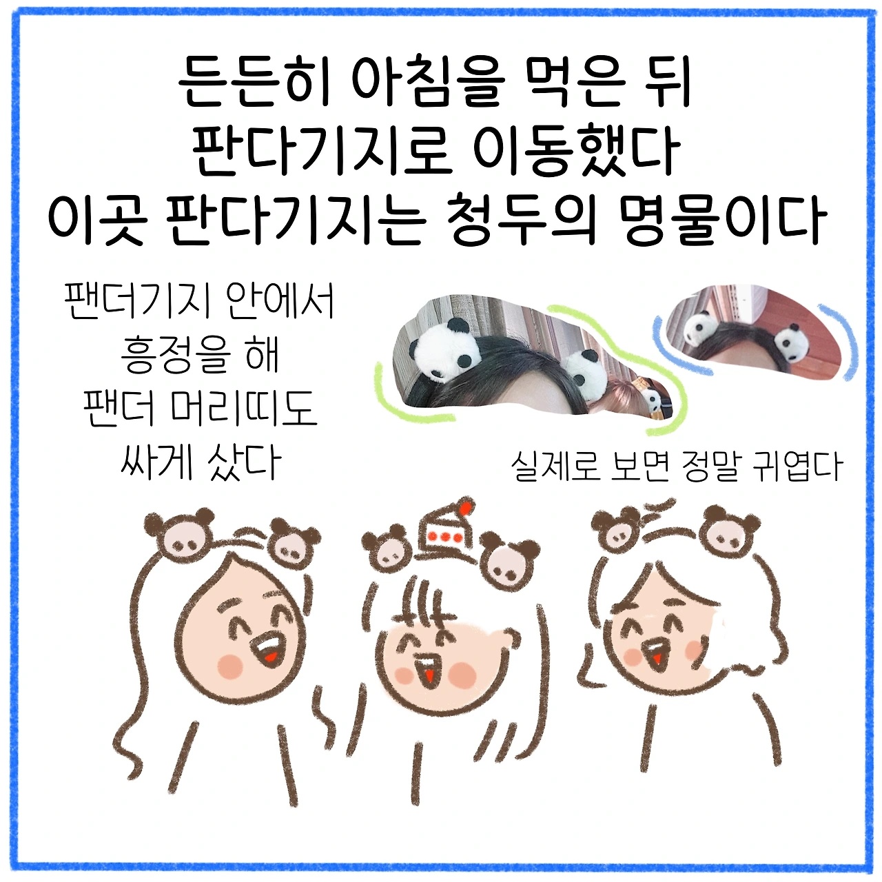 청두에 오는 여행자가 꼭 들려야만 하는 필수 관광 코스, 바로 팬더 연구기지이다. 이곳은 일반 동물원과는 달리 판다를 전문적으로 키우기 위해 따로 만들어진 연구기지로, 큰 산 안에서 자유롭게 노는 팬더들의 모습을 볼 수 있어서 굉장히 좋은 곳이라고 할 수 있었다. 당시의 일상에서 너무나도 당연했던, 게스트하우스의 아침이 너무나도 그러워지는 순간이다.