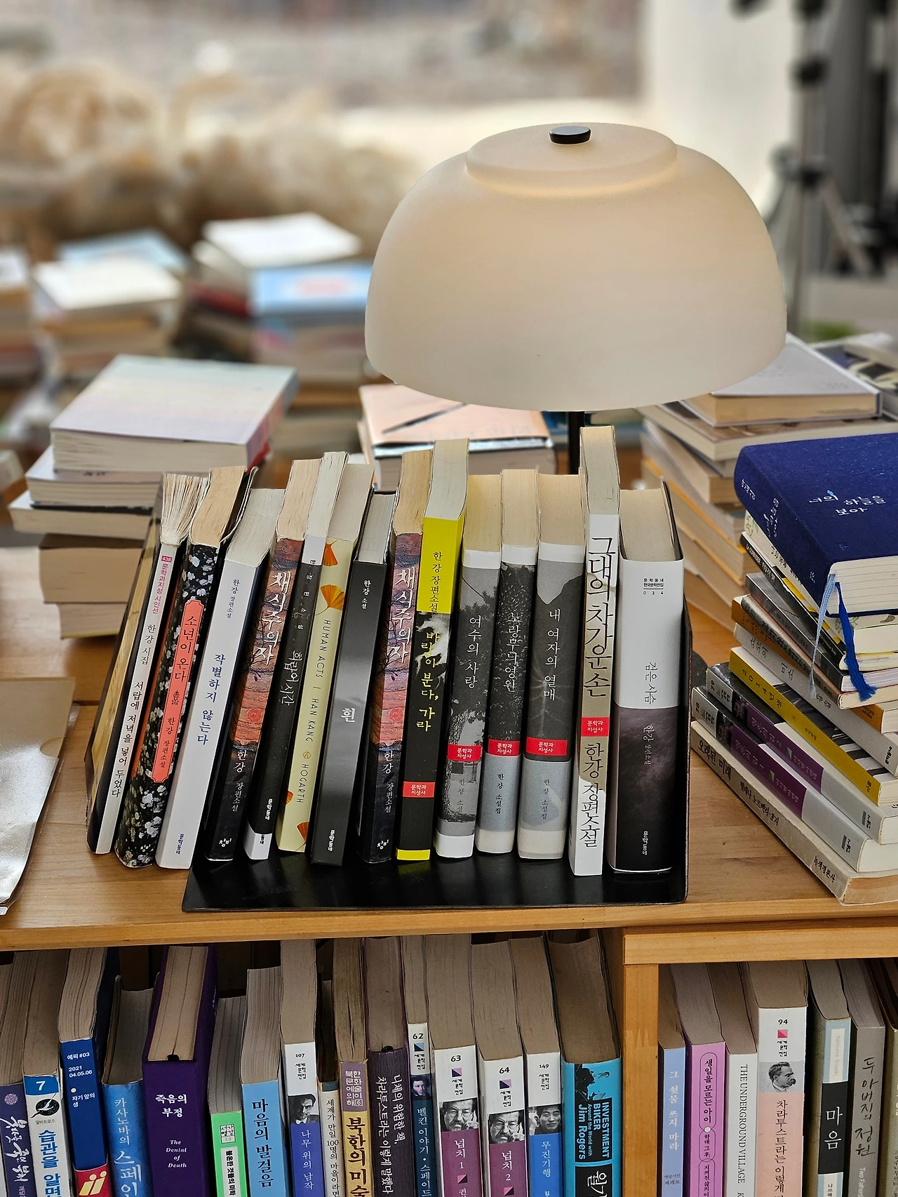 그리고 보이는 공용 거실 겸 주방에서는 은은하게 클래식FM이 흘러 나오고 있었고, 주황빛의 조명이 나무 책상과 책장을 비춰주고 있었다. 우와-하며 잠깐 구경은 하는 사이 호스트님이 연극에서 짜기라도 한 듯 다른 방에서 나와 반갑게 인사해주시고, 안내를 해주셨다. 책이 많은 공간이라 따로 분류는 해두지 않았지만, 한강 작가의 책 만은 특별히 한 쪽 공간에 코너를 마련해두셨다고 한 것도 참 좋았다.