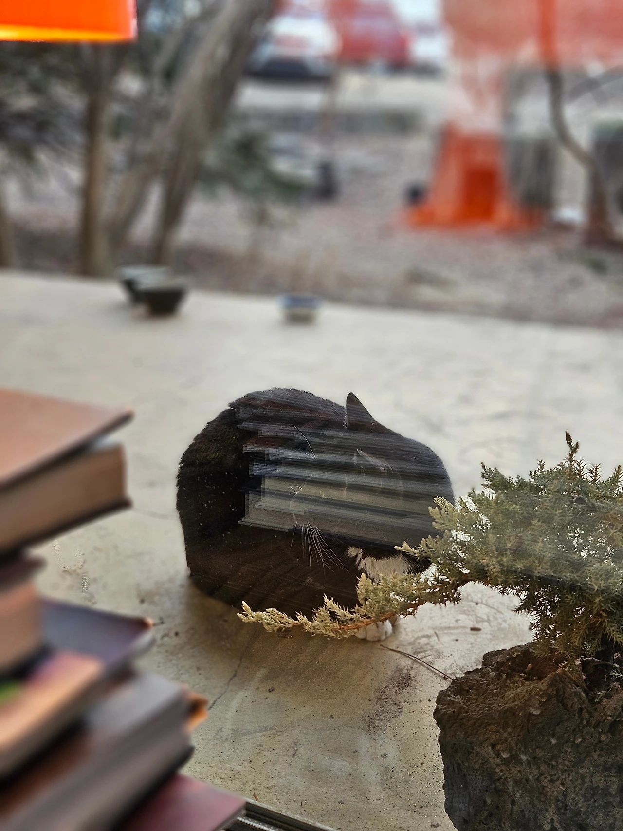 공용 거실의 분위기에 홀딱 반해버린 나는 짐을 풀고 바로 책 한권을 골라 나무 책상앞에 자리 잡았다. 공용 거실 옆 베란다, 테라스 공간에 길냥이들을 위해 물과 사료를 둔 그릇이 보였는데, 귀여운 치즈냥이와 검정 턱시도를 입은 냥이가 일상이라는 듯, 스르륵 다가와 사료 한 번, 물 한 번, 슥슥 그루밍 한번. 나는 책 한 페이지, 냥이 훔쳐보기 한 번. 졸려서 낮잠을 자겠다던 남편도 어느새 방에서 나와 각자 자리를 잡고 고요 속에 독서시간을 가졌다.