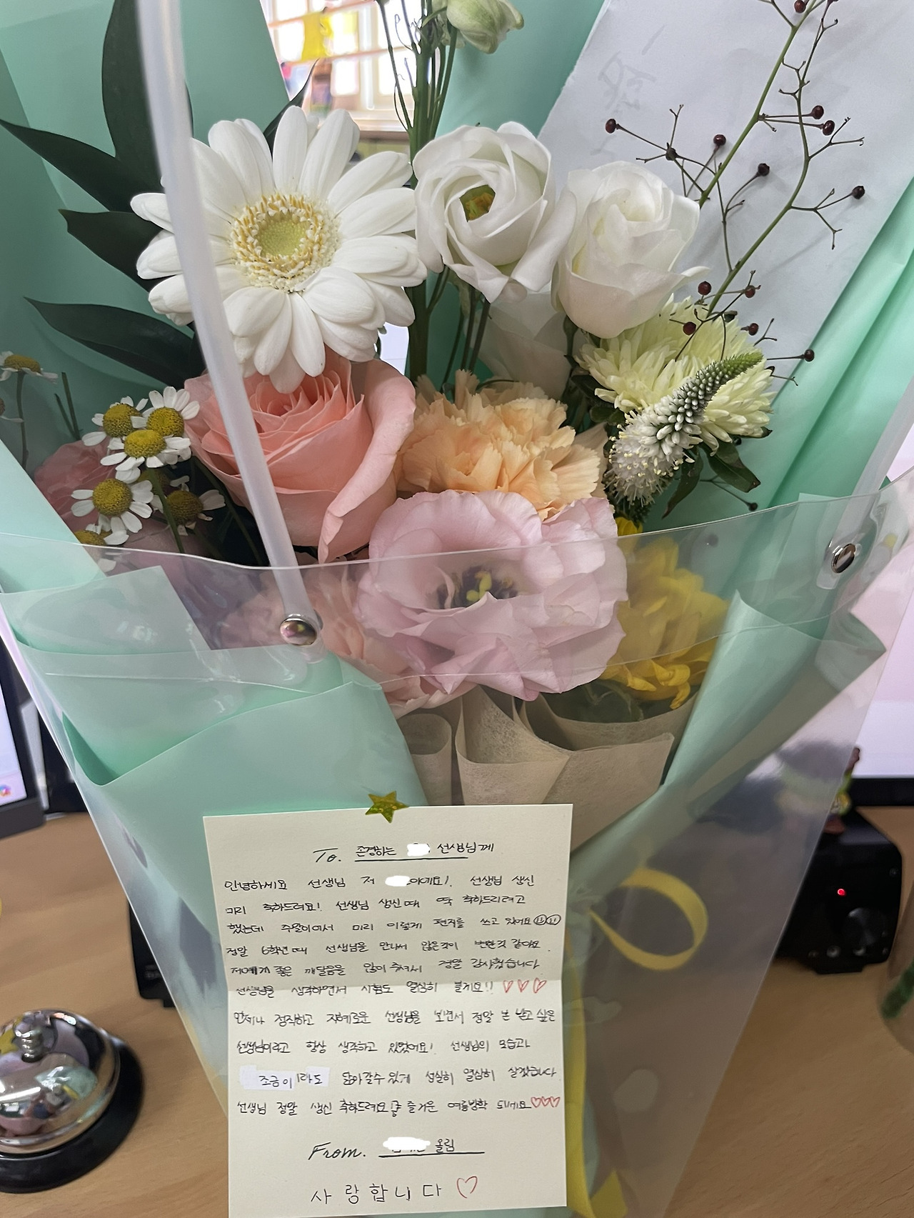이 아이들은 1년 전에 말한 내 생일을 기억하고 이를 챙겨주기 위해 온 것이었다. 코 묻은 돈 하나 둘 모아 산 예쁜 꽃다발을 안겨주며 말이다. 이 순간 나는 생각했다.