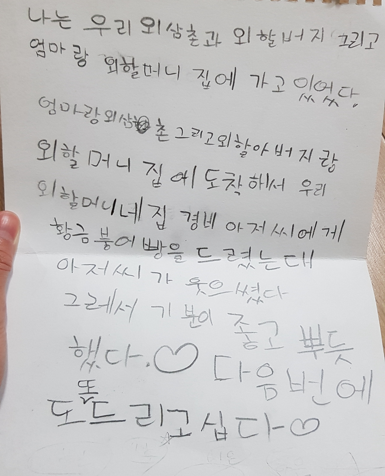 여전히 아이는 자신이 느낀 감정과 느낌을 글로 남기는 것을 좋아한다. 아마도 그런 행동이 좋은 행동을 더