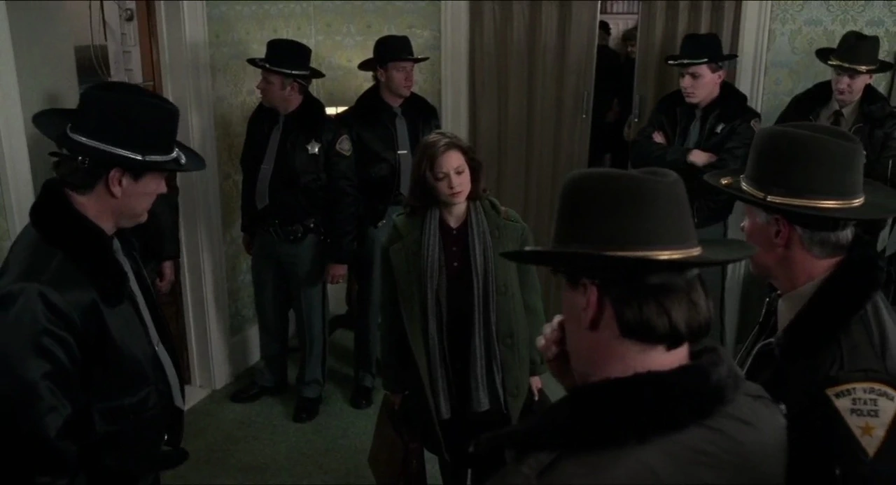 크로포드가 클라리스 앞에서 “성범죄와 관련된 이야기는 여자가 없는 곳에서 하자”라고 말하는 순간, 클라리스를 FBI가 아닌 여성이라는 성별의 관점으로만 바라보는 남성들의 시선처럼 은밀한 폭력도 표현한다. 사건을 수사하고 있는 것은 클라리스인데, 클라리스의 공은 아예 배제해 버리는 상황이다. 사실 이 부분에서 원작 소설과 영화의 차이가 나타난다. 크로포드가 클라리스를 배제했던 게 경찰들을 안심시키려는 연막이었다고 말하자, 소설 속 클라리스는 “경찰들은 부장님이 누군지 알고 있습니다. 부장님을 보면서 어떻게 행동해야 할지 판단하죠(공보경 옮김, p.138)”라며 아주 부드럽게 자신의 의견을 표한다. 그러나 영화 속 클라리스는 이것이 “아주 심각한 문제”임을 콕 집어 강조한다.