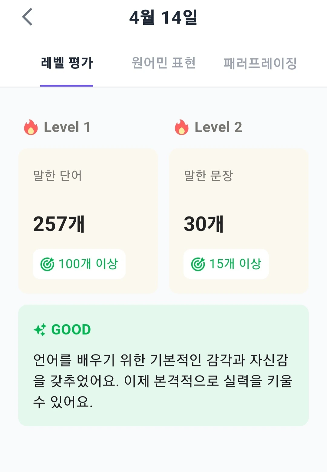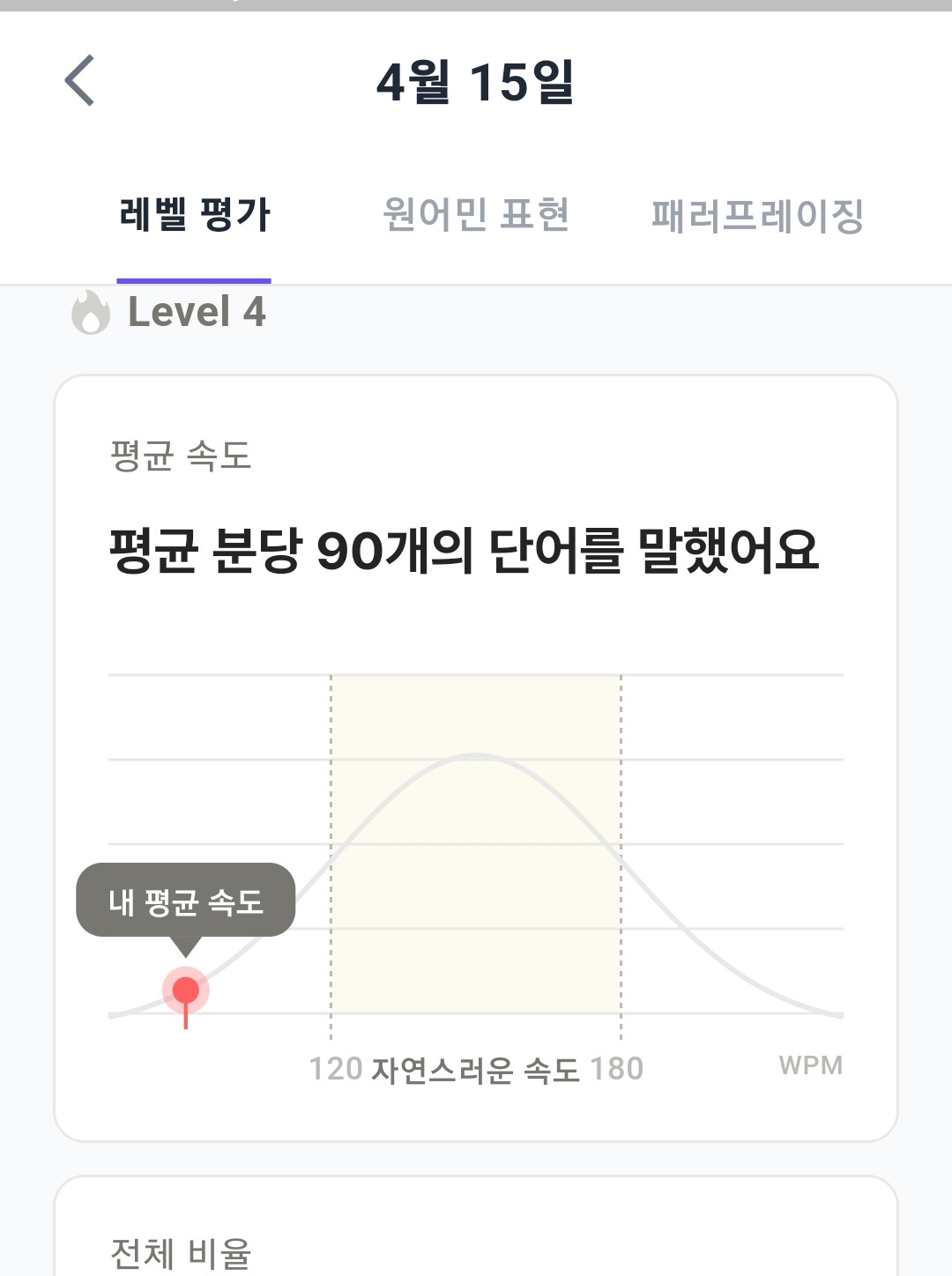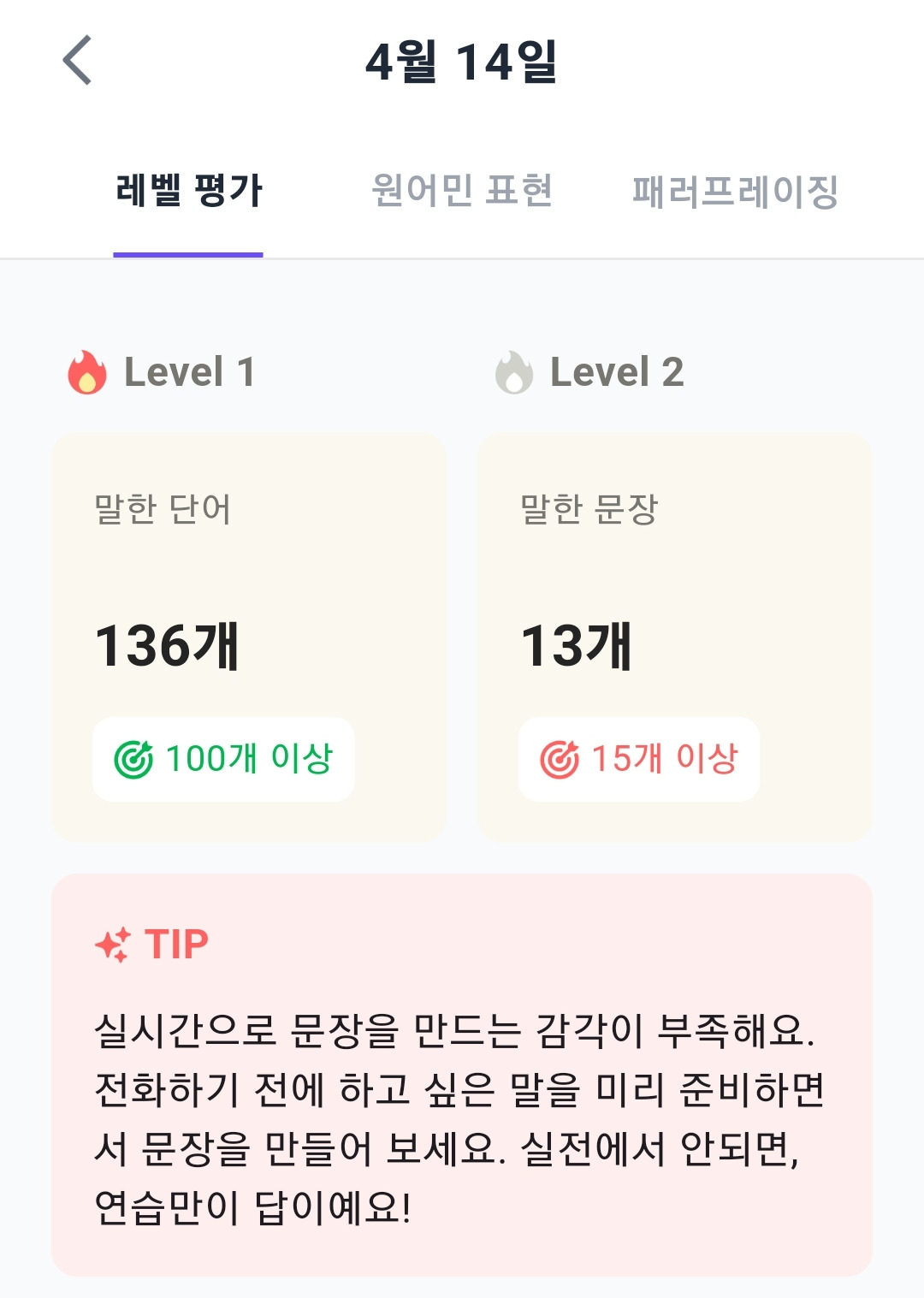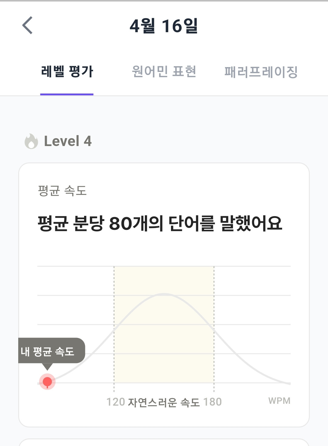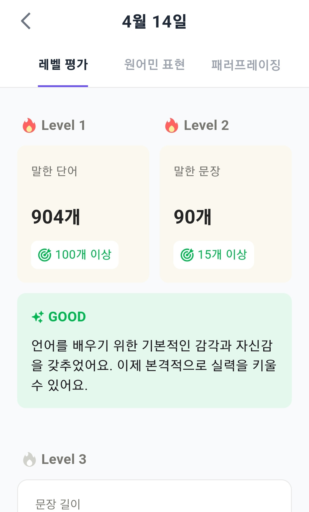 특히 어제 4월 15일은 말을 참 많이 하였는데, 신기하게도 레벨 4가 나왔다.