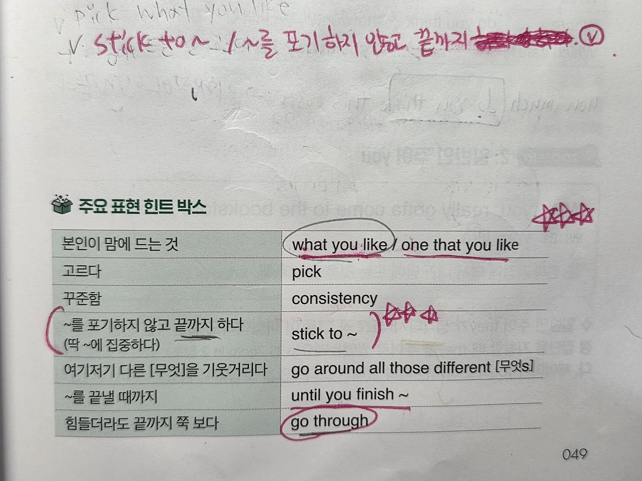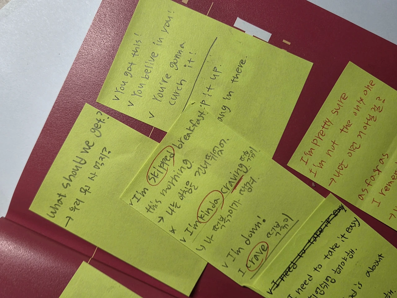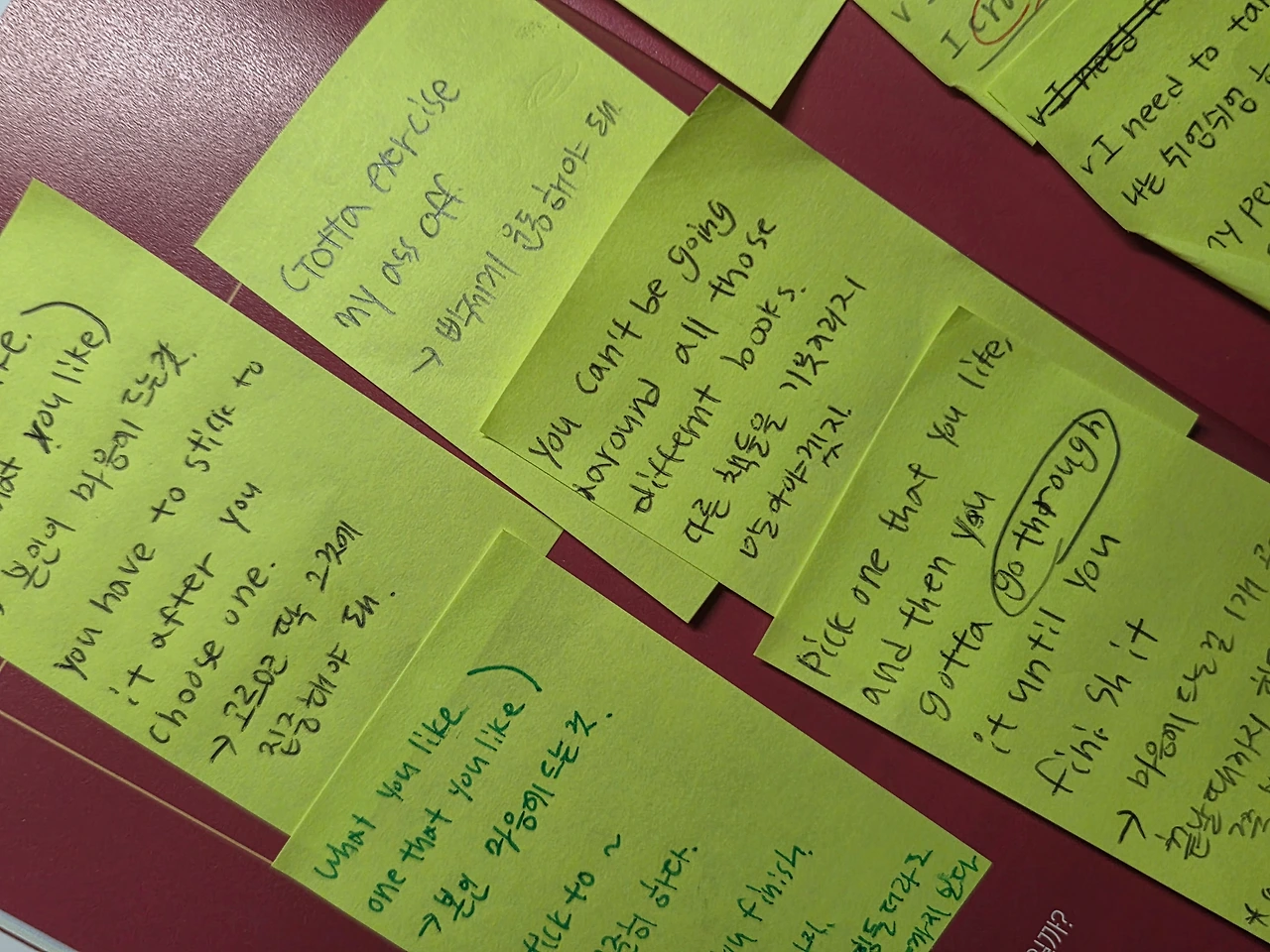 이 교재에 나오는 표현들을 한눈에 외우기 위해서 포스트잇으로 정리했어요.