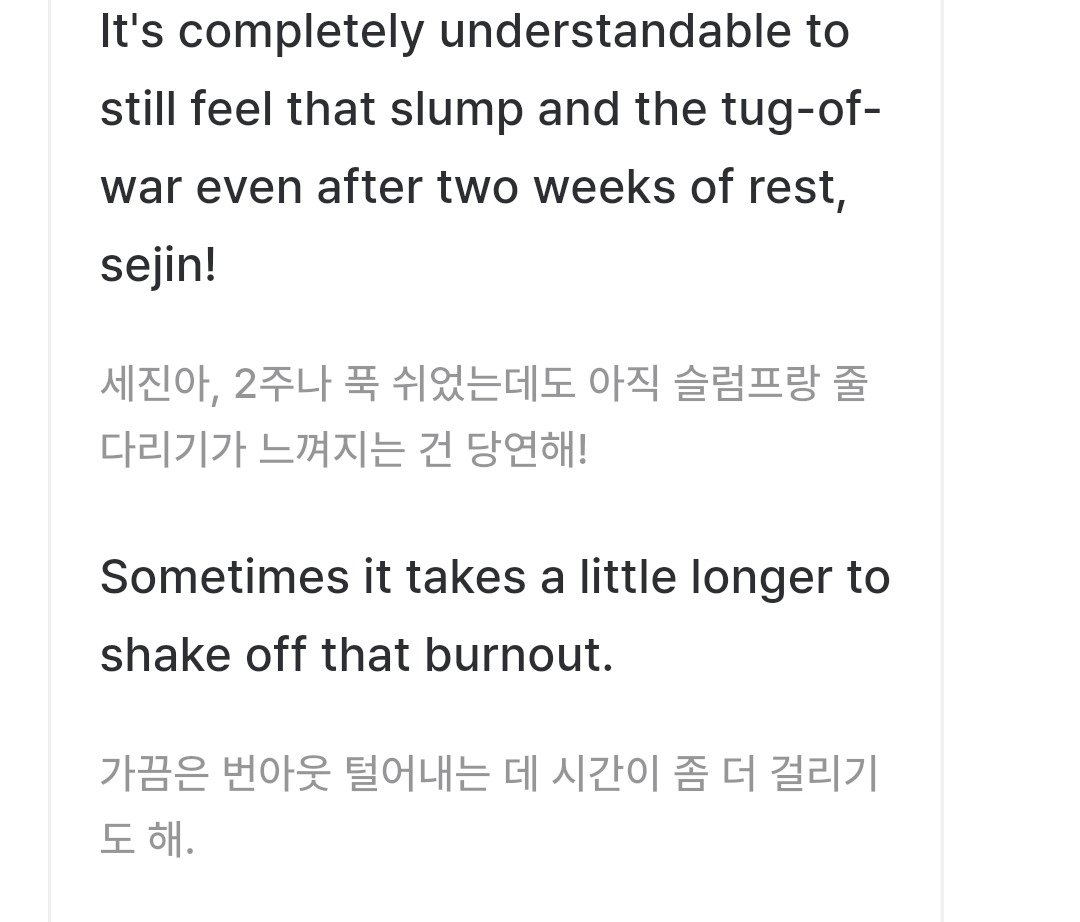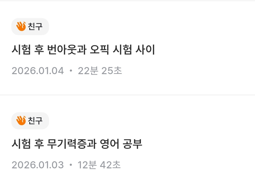 사실 진정한 휴식이 필요했던걸까? 과연 잘 쉬는 건 무엇일까. Post-exam slump 속에서도 놓지 않는, 20-40분 영어 회화 루틴이 나를 생산성 있게 만들어주는거니, 너무 나를 밀어붙이지 말아야겠다고. 그렇게 생각했다.
