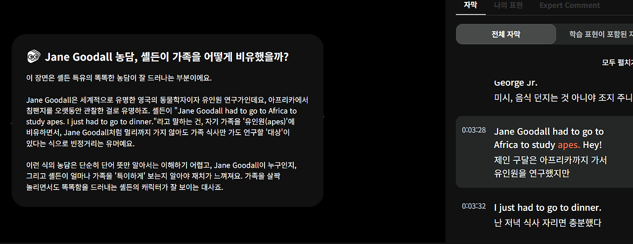 이걸 소개하고 싶어서 내가 힘들게 PC 캡쳐를 했다. 랭플릭스로 미드를 보면 진짜 좋은 장점이 이렇게 해설이 있는 거다! 이 장면은 <영 쉘든> 식탁에서 싸우는 오빠와 동생의 모습을 보고 이렇게 나오는 농담이다. 그런데 대충 그렇구나 - 할 수 있는 장면을 이렇게 해설을 적어두니 더 재밌게 볼 수 있다. 진짜 다양한 농담들도 나오고 특히 이걸 몇 편 보다보면 미국식 유머에 이게 뭔 소리야? 할 수 있는 부분 해설까지도 있어서 참 좋았다. 여기서는 소개하지 못하겠다. 하지만 해설도 어느정도 이해할 수 있게 적어놨다. 나는 해설 없었으면 미국식 저 농담은 이해하지 못했겠다 싶은 것도 있었다. 여기에 쓰기는 수위가 좀 있다. 어린이 나오는 드라마인데도 미국식 농담 넣어둔 감독 칭찬해. 내가 덕분에 미국식 농담을 배우네. 근데 농담 맞지? 문화차이 쩐다.