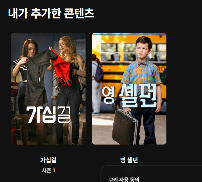 이렇게 랭플릭스로 들어가면 내가 학습하고 있는 콘텐츠가 뜬다. 가십걸은 일부러 먼저 담아놨다. 저게 너무 중독성 있을만큼 재밌대서 참고 있다. 영 셸던은 진짜 너무 재밌는 시트콤이라 가볍게 보고 있다.