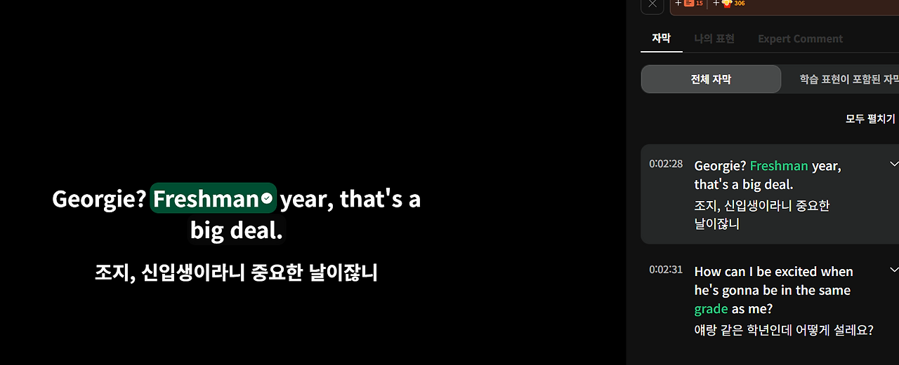 여기서 잘 살펴보면 초록색 글자들이 보인다. 초록색 글자들은 내가 1화를 볼 때, 모른다고 표시한 후 복습한 표현들이다. freshman이 신입생이라는 단어라는 걸 외우고 싶어 표시했고, 복습을 완료했기에 초록색으로 뜬다. grade는 알고 있지만 freshman과 같이 복습하고 싶어 넣어두었다. 이렇게 내가 복습한 표현들을 초록색으로 뜬다.