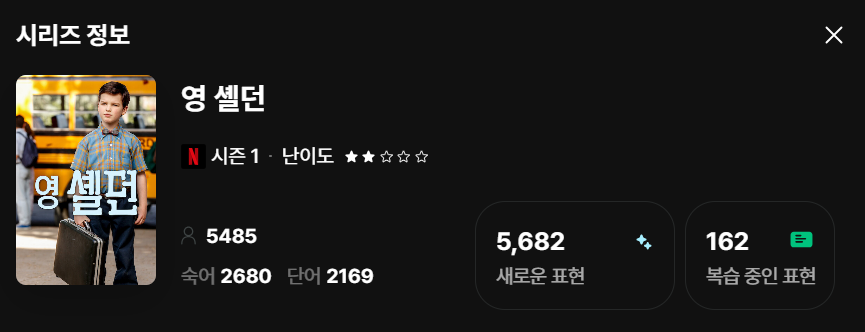 이렇게 드라마를 클릭하면 시즌 1, 난이도는 어느정도인지, 새로운 표현과 숙어 이런 것들이 뜬다. 복습중인 표현은 모바일 어플에서 내가 복습하고 있다는 뜻이다. 지금 이 포스팅에서는 내가 대략적으로 어떻게 사용하고 있는지를 소개해주고자 한다. 2편에서는 <영 쉘든>으로 그래서 어떤 표현을 배우고 공부하는지, 랭플릭스를 어떻게 활용하고 있는지를 자세히 다루겠다. 지금 이 글을 읽고 있는 당신! 미드를 좀 더 편하게 공부하면서 보고 싶을테니 짧게 보여주겠다.