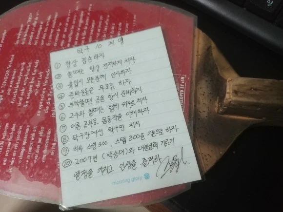 그렇게 탄생한 것이 "탁구 10 계명"이다. 그 당시 작은 메모지에 탁구를 즐기면서 꼭 필요한 10가지를 정리해서 적었다. 코팅을 해서 아직도 가방에 가지고 다닌다. 이 종이를 보고 있으면 그 당시 그리운 사람들과 추억이 많이 생각난다.부끄럽지만 공개한다. 개인적으로 탁구 왕초보 때 적은 10 계명이 많은 도움이 되었다.