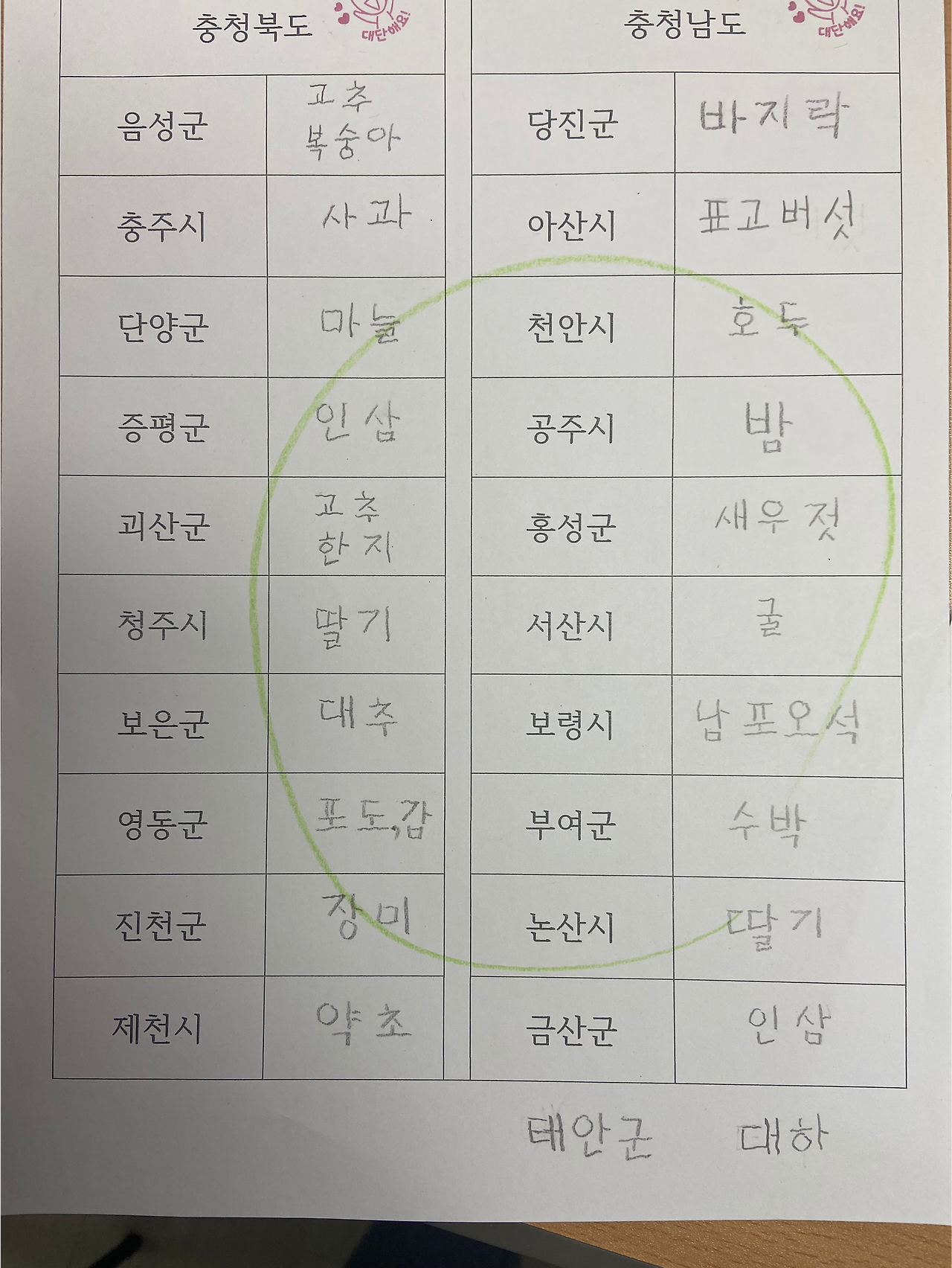 지도를 보면서 찾기 어려워하시는 분들은 지역 이름을 반복해서 써보기를 했다. 몇몇 분들은 지도를 보면서 특산물을 찾아서 적어오셨다. 꼼꼼하게 적어오신 숙제를 보면 기분이 좋아진다. 어르신 앞에서 색연필로 동그라미를 크게 쓰고 ‘잘했어요’ , ‘대단해요’ 도장도 팍팍 찍어드린다. 그럼 어르신과 나는 함께 웃음이 흘러나온다. 스탬프 하나만으로도 분위기가 좋아진다. 누구에게나 칭찬은 좋은 거다.