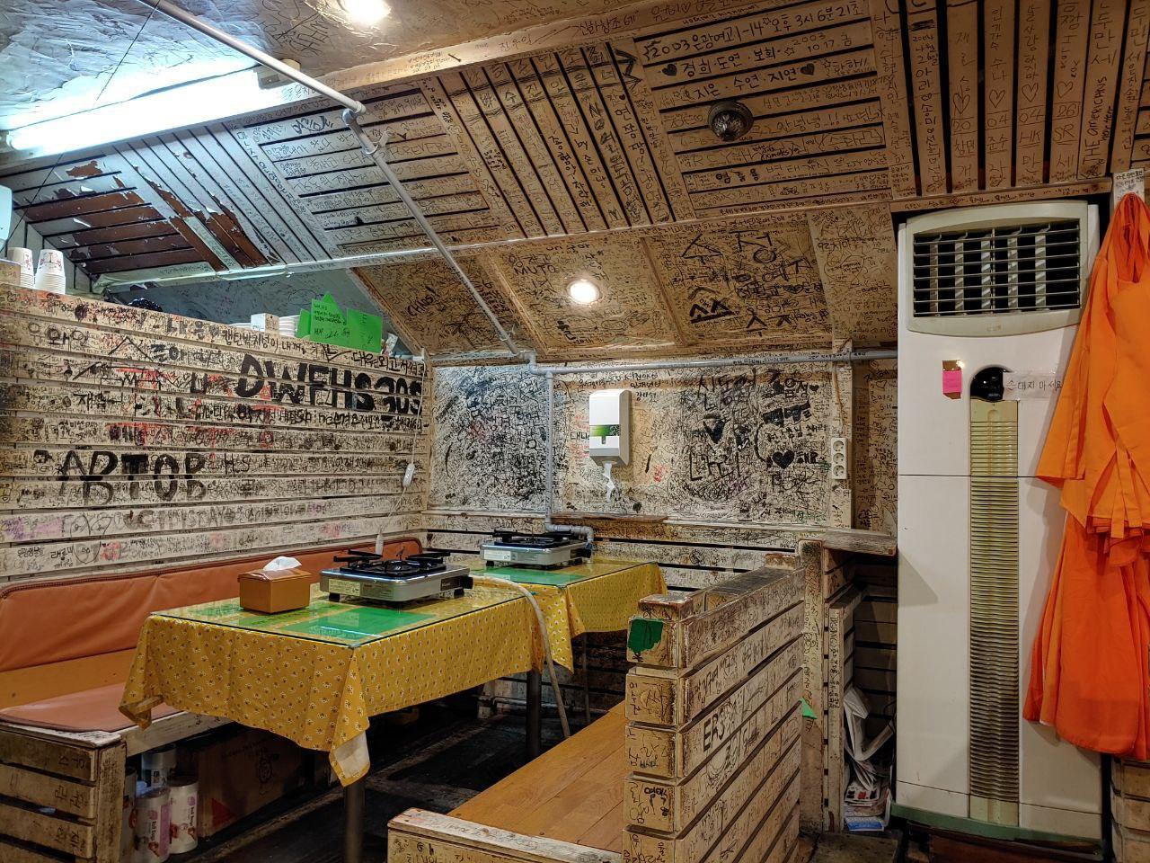 행복을 바라는 무리들이 하나 둘 여기로 모여든다. 벽에 가득한 낙서들이 우리의 시선을 사로잡는다. 빼곡히 벽을 메운 글귀들이 모여 마치 이쪽은 바스키아(Jean-Michel Basquiat) 작품 같고 저쪽은 잭슨 폴록(Paul Jackson Pollock)의 작품 같은 이곳, 작은공간은 떡볶이의 신전이다. 신도들은 저마다 추억과 소망을 담아서 떡볶이의 신에게 호소했고, 그 마음들이 모여 삶을 고양하는 하나의 예술이 되었다.