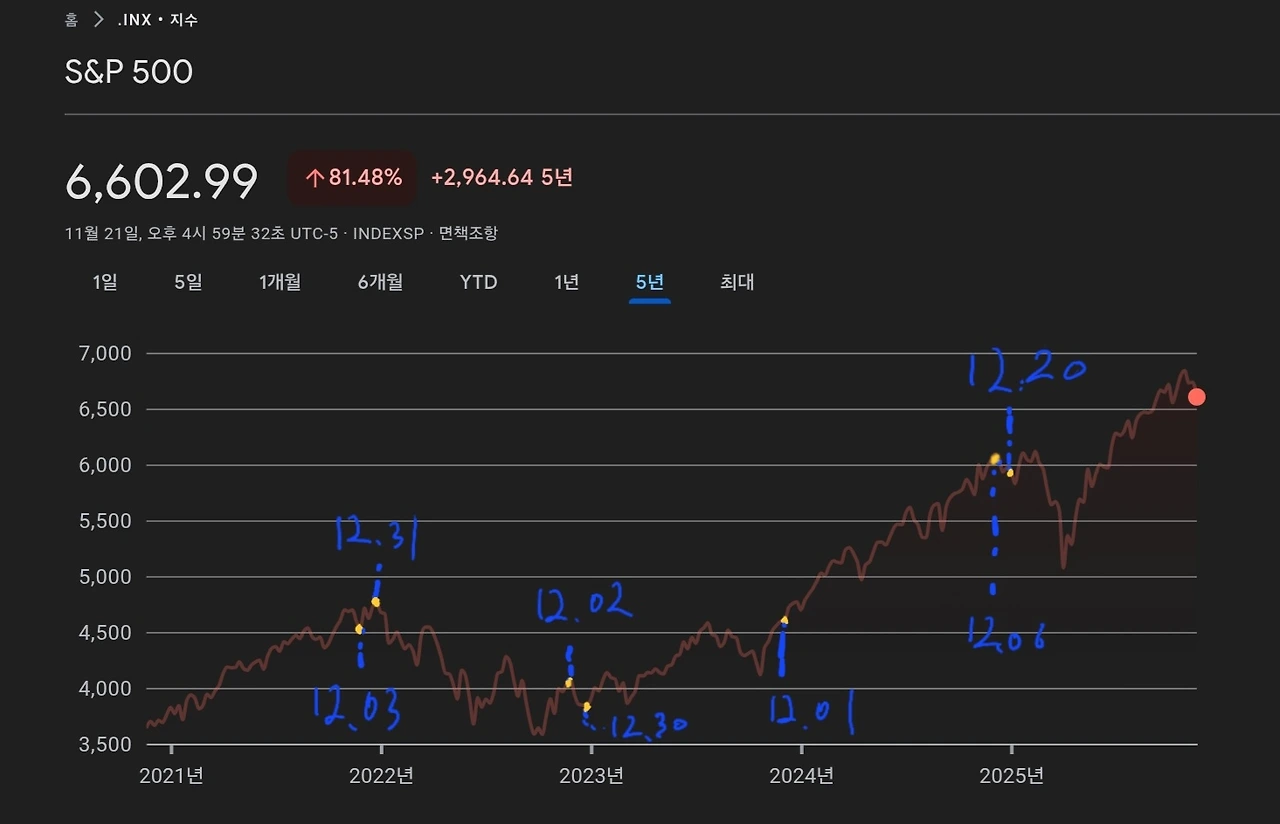 하지만 최근 5년 간의 연말 S&P 500 지수만 보더라도 일정한 법칙이 존재하지 않는다는 것을 알 수 있다.