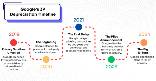 당초 구글은 개인 정보 보호 강화를 이유로 2022년부터 서드파티 쿠키 지원을 단계적으로 축소해 2024년 말, 이후 2025년 초까지 완전히 중단할 예정이었습니다. 그러나 2024년 7월경, 구글은 이러한 전면 중단 계획에서 물러나 서드파티 쿠키를 계속 지원하되, 사용자가 직접 설정을 통해 제어할 수 있도록 하는 '사용자 선택' 모델을 도입했습니다. 이로써 2025년 초 로 예상되었던 기존의 전면적인 서드파티 쿠키 중단 계획을 사실상 보류하는 것이었습니다.