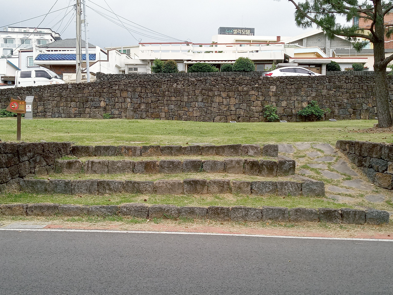 서귀진 성터와 서귀진 객사 건물터 추정지가 길 양쪽으로 마주 보고 인접해 있었다. 기념으로 사진에 담았다. 길을 건너 오가며 사진을 찍다 보니 역사 탐방을 하는 기분이었다. 서귀포의 역사 유적지를 지나 서귀진성에서 동쪽으로 다시 방향을 잡고 계속 길을 걸었다. 햇볕이 너무 따갑고 덥고 발도 아프고 해서 그냥 돌아갈까 하다가 여기까지 걸어온 게 아까워서 다시 발걸음을 재촉했다.