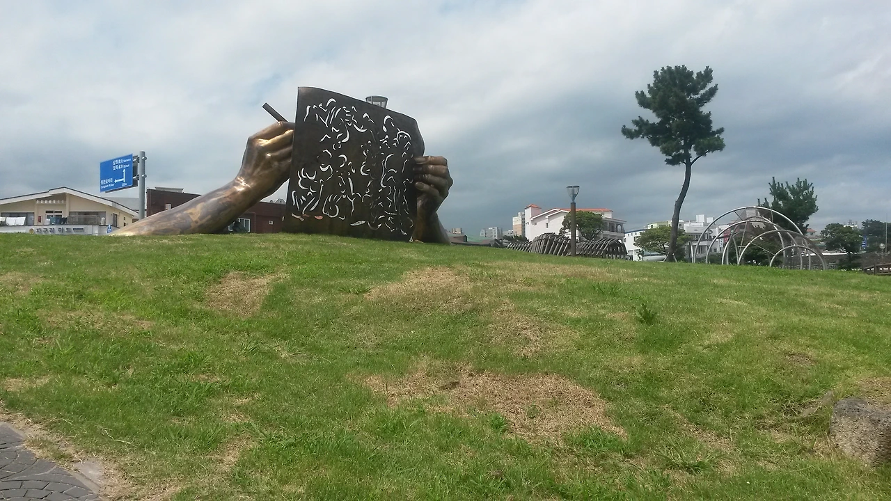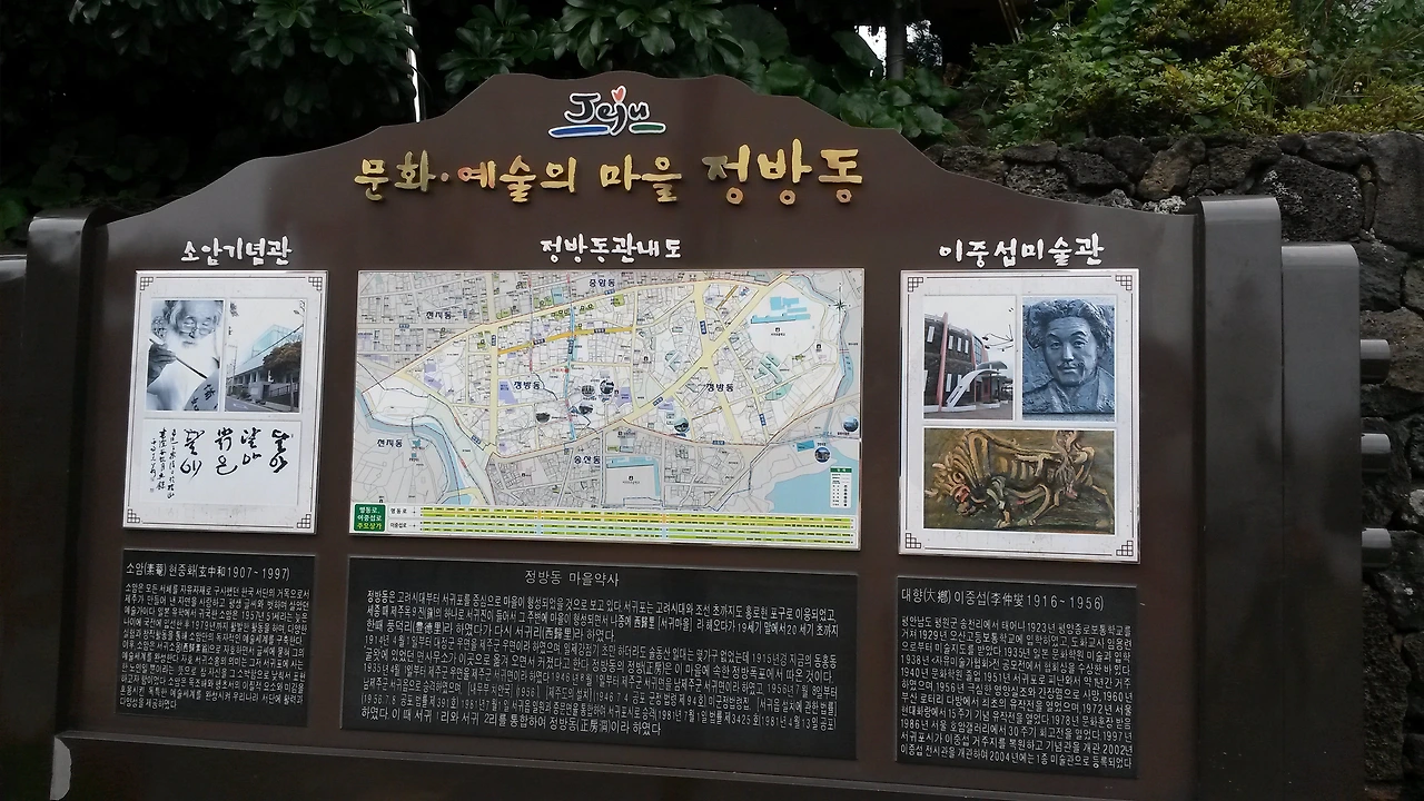 *자구리: 제주특별자치도 서귀포시 송산동에 위치한 해안경승지로 화가 이중섭이 6.25피난 시절 가족과 함께 게를 잡으며 지냈던 곳이기도 하다. 자구리 문화예술공원이 조성되어 있어 작가들의 작품을 감상하며 산책할 수 있다.
