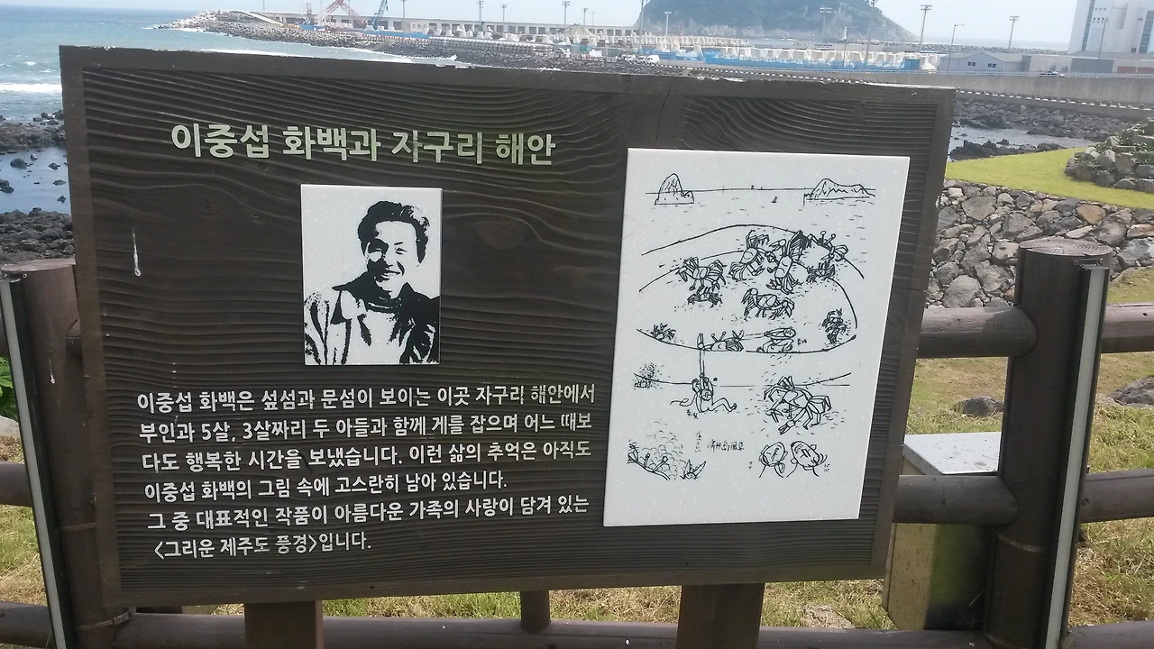 화가 이중섭이 6.25 전쟁 때 제주도에 피난 왔던 시절 부인과 두 아들과 함께 게를 잡으며 배고픔을 달래고 예술적 영감을 얻었던 그 자구리 바닷가였다.