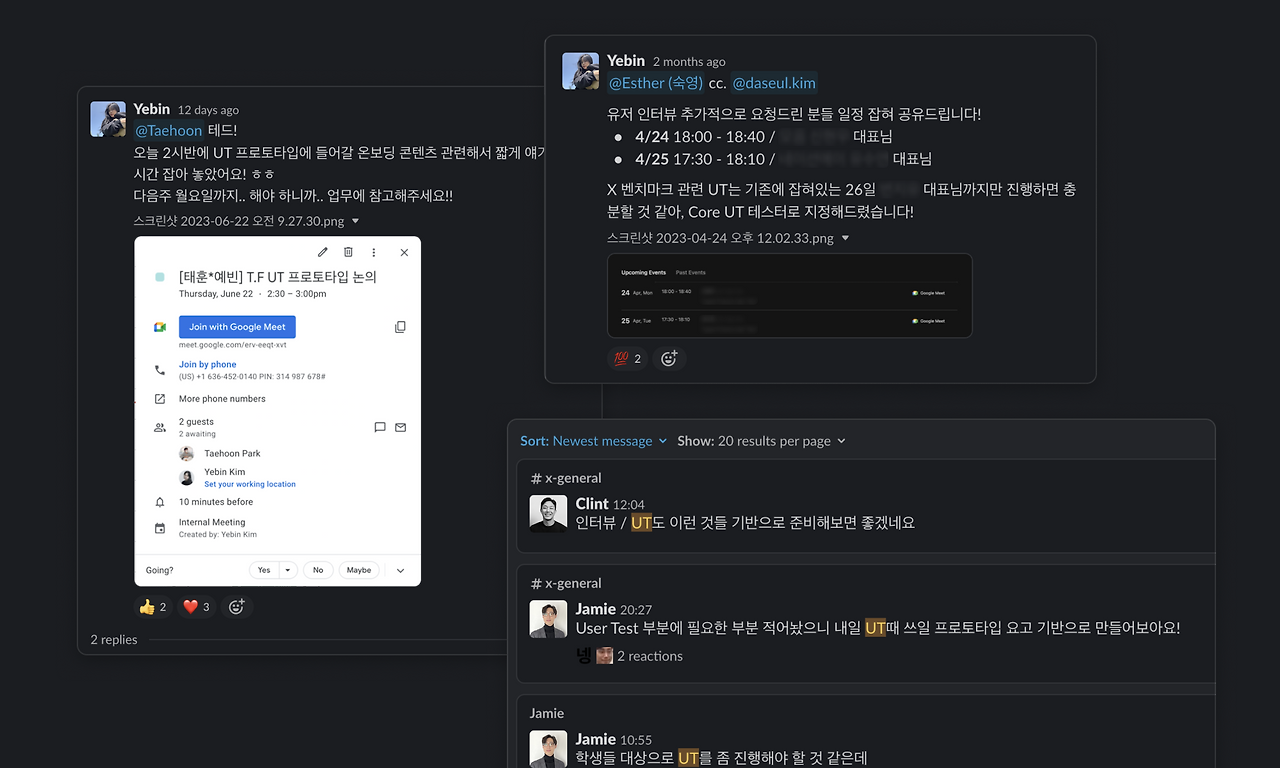 최대 세 가지의 검증해야 하는 Customer Job을 우선순위화한 후 이에 맞는 프로토타입을 준비해야 해요. 동시에 CX 팀에게 메시지를 보냅니다. 이러한 것들을 검증하기 위해 테스트할 대상은 이런 조건의 사람들이고, 기간에 맞추어 언제까지 모수를 수집해달라고요. 요청 후 보통 일주일 안으로 사용자분들과의 일정이 확정되고 전체 검증 기간은 2주 정도로 두어 최소 3명, 최대 5명의 사용자분들을 만납니다. 첫 일정이 잡히기 전에 UT 시나리오를 작성하고 프로토타입을 제작을 시작해요.
