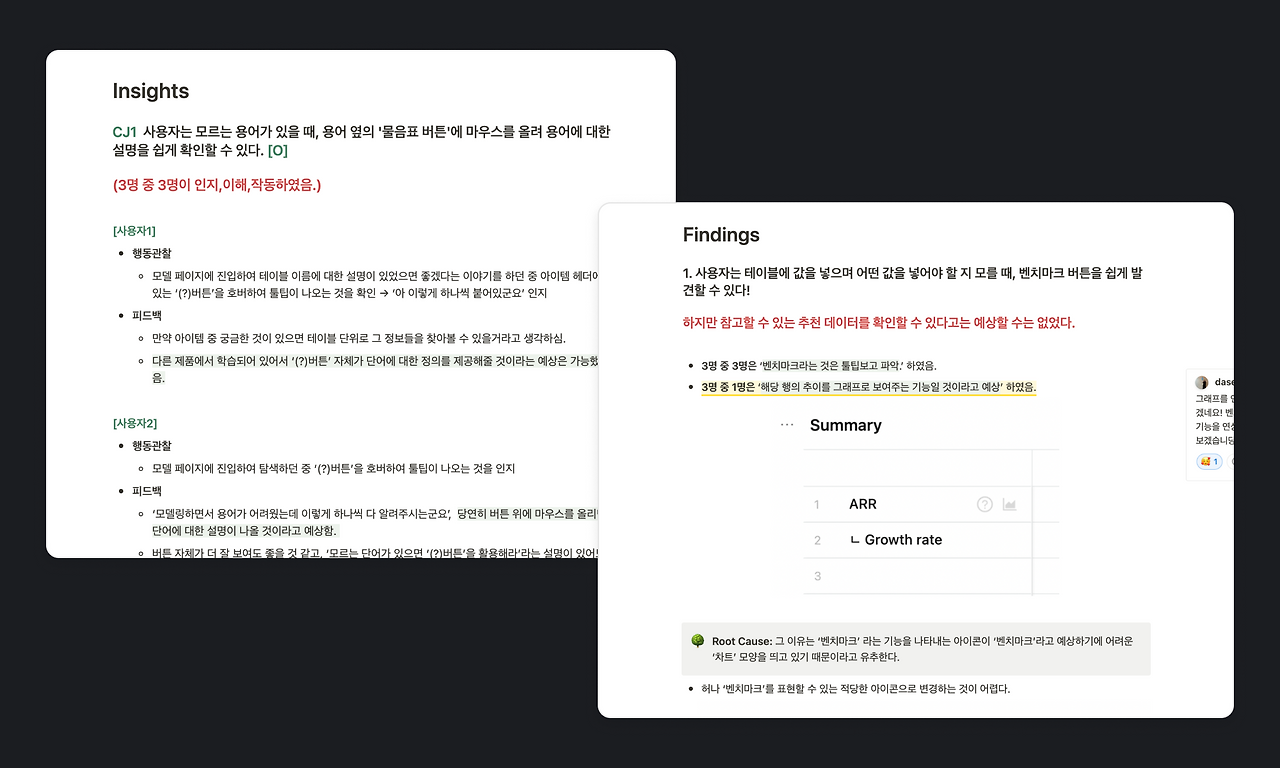 많은 시행착오를 겪은 후, 현재는 우리가 발견한 문제점, 예상과 달랐던 점, 사용성 문제에 대한 근본적인 원인을 최대한 ‘N명 중 N명’이 ~인지, 이해 혹은 작동함’과 같은 건조한 인사이트로 도출해내려고 노력하고 있어요. 이 과정 중에서 사용성 문제의 근본적인 원인 즉, Root Cause을 찾아내는 것은 아직까지도 쉽지 않은 것 같아요. 결국에는 사용자분에게 직접 이유를 묻지 않고 ‘관찰’과 ‘정성적인 데이터’를 통해 진짜 이유를 찾아내는 것 또한 저희의 역량이죠.