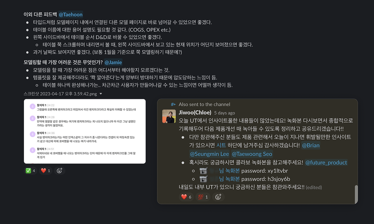 UT 이후 인사이트를 ‘잘’ 전달하는 것도 중요해요. 팀원들에게 결과를 전달할 때도 최대한 인터뷰이의 말투 그대로 전달하는 것이 효과적이에요. 내부 인원의 언어로 희석되어버리면 팀원들에게 깊이 있게 다가가지 않는 것 같더라고요. 그 당시 말을 한 시점의 이미지나 영상 등을 녹화하여 공유하는 것도 좋은 방법입니다.