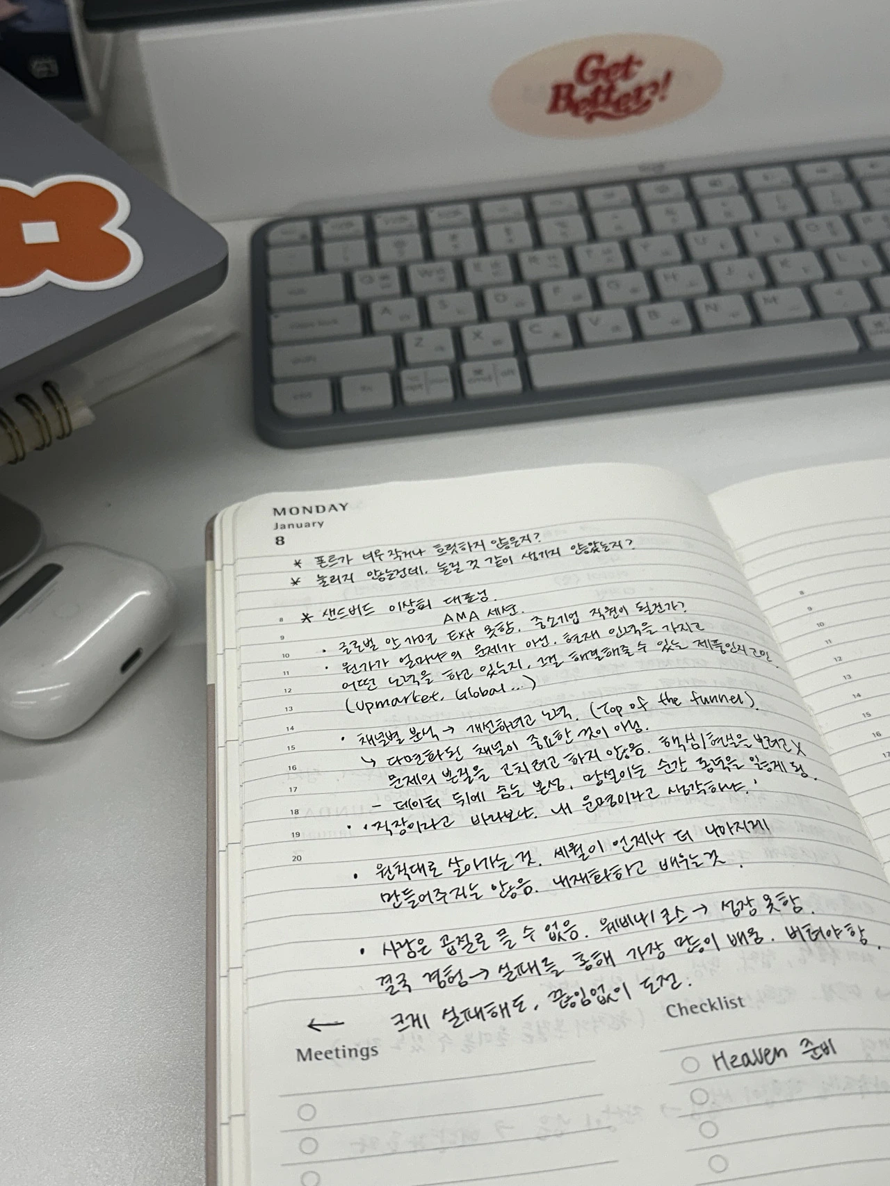 지난달, 센드버드 코리아 대표이자 APAC 총괄이신 이상희 대표님이 AMA 세션을 위해 저희 사무실에 방문해 주셨습니다. 모두가 잘 아는 기업, 센드버드로 성장시키고 성공할 수 있었던 경험이 묻어 나오는 답변들에, 한 순간도 이야기를 놓치기가 아까워서 노트에 빼곡히 적어가며 들었던 귀중한 시간이었는데요. 덕분에 모두의 머릿속에 흐릿하게 그려져있던 물음표에 대한 방향을 다잡아볼 수 있었어요. 그중 가장 인상 깊었던 내용을 공유해 보려 합니다.
