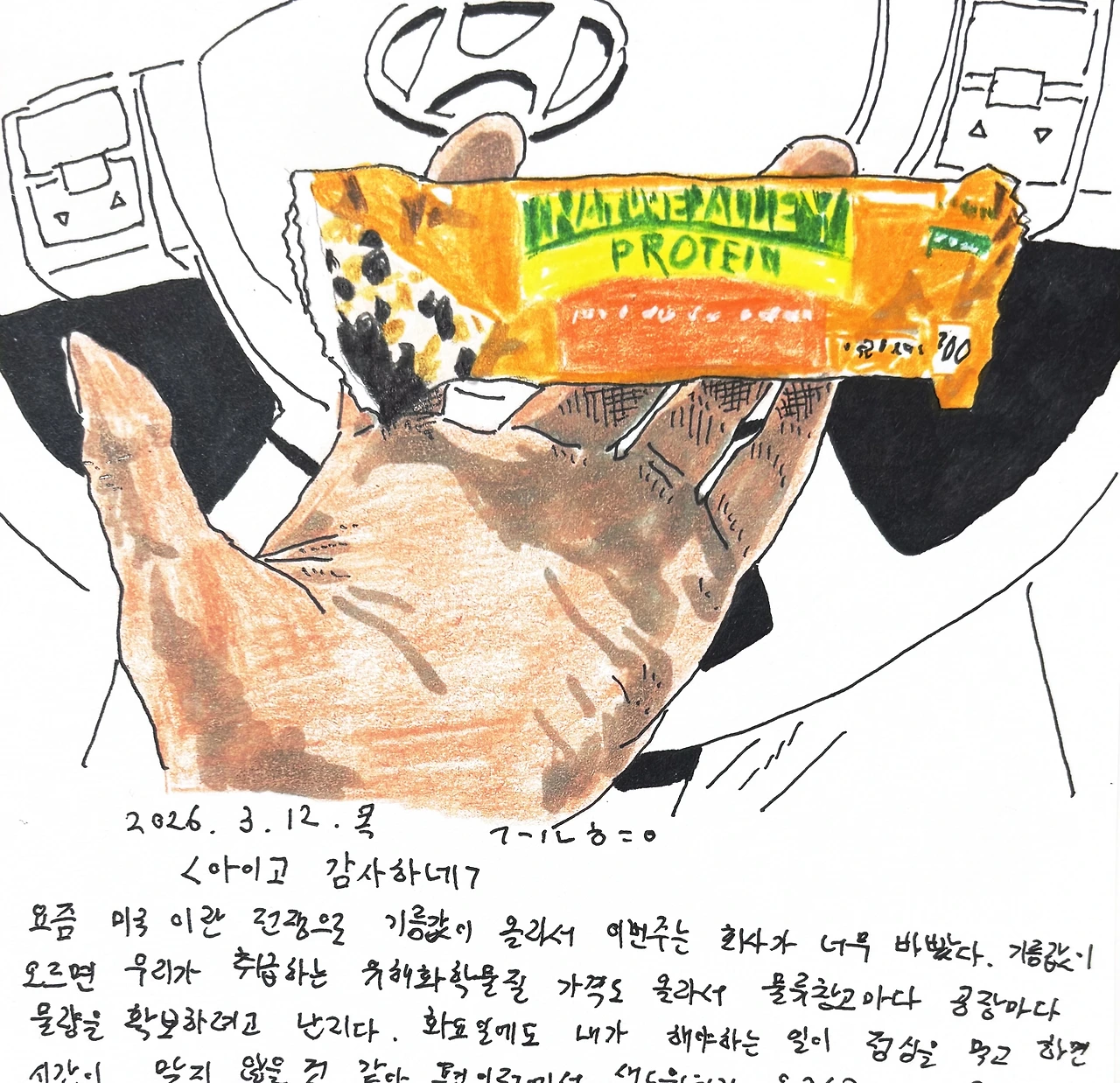 요즘 미국 이란 전쟁으로 인해 기름값이 올라서 그런지 이번주는 회사가 너무 바빴다. 기름값이 오르면 우리가 취급하는 유해화학물질 가격도 올라서 물류창고마다 공장마다 물량을 확보하려고 난리다. 화요일에도 내가 해야하는 일이 점심을 먹고 하면 시간이 맞지 않을 것 같아 편의점에서 샌드위치랑 음료수를 사서 운전을 하며 먹었다. 밥 먹는 시간 30분이라도 줄여야 일이 될 것 같았다. 거래처 한송에 점심시간에 도착했다. 나혼자 공드럼 40개를 다 내려야 하는데 마침 친분이 있는 직원이 일을 도와주었다. 보통은 점심시간에 쉬고 있지 도와주지 않는 편이고 거래처 직원에게도 나혼자 내릴테니 점심시간이니 쉬어라고 말했음에도 와서 도와주었다. 덕분에 20분정도 시간을 절약하게 되었다. 드럼을 내리면서 오늘 너무 바쁘다고 앓는 소리를 하니 회사에서 나갈때 나에게 프로틴 바까지 하나 챙겨주었다. 다른 거래처에 갔을때도 드럼을 싣는데 도와줘서 15분정도 시간을 줄일 수 있었다. 덕분에 내일 할 일 하나를 오늘로 땡겨서 처리할수 있었다. 정신없이 바쁘고 점심도 못먹고 쉬지도 못했지만, 다른 동료들도 쉼없이 일했다고 했다. 프로틴바를 먹으면서 참 고마운 마음이 들었다. 담주 정도되면 바쁜것도 잠잠해 지겠지…