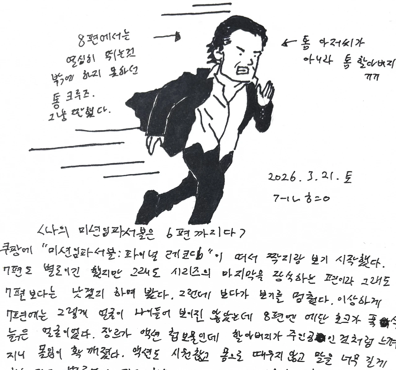 쿠팡에 “미션임파서블: 파이널 레코딩”이 떠서 짝지랑 보기 시작했다. 7편도 별로이긴 했지만 그래도 시리즈의 마지막을 장식하는 편이라 그래도 7편보다는 낫겠지 하며 봤다. 그런데 보다가 보기를 멈췄다. 이상하게 7편에는 그렇게 얼굴이 나이들어 보이진 않았는데 8편엔 에단 헌트가 폭삭 늙은 얼굴이었다. 장르가 액션 첩보물인데 할아버지가 주인공인것처럼 느껴지니 몰입이 확깨졌다. 액션도 시원찮고 몸으로 때우지 않고 말을 너무 길게 하는 것도 별로였다. 과거 회상씬이 너무 많고 에단 헌트 한명이 세상을 구원하는 내용이니 영화가 너무 진지해져서 늘어지고 지루했다. 나이가 들어 예전같은 액션이 안되면 그냥 6편까지 하고 마무리 했어도 되지 않았을까. 팬들의 기대를 깨면서까지 시리즈를 마무리했어야 할까? 미션임파서블의 묘미는 팀원들과의 환상적인 팀워크인데 7편부터는 그런 팀워크가 보이질 않았다. 오프닝씬의 작전이 끝나고나서 테마곡이 나올때 심장이 두근두근 설레였는데, 8편에서의 오프닝씬 작전은 너무 시시해서 테마곡이 나와도 김이 빠졌다. 잠수함씬이 대단하다는 평이 있긴 했지만 그냥 영화보기를 멈췄다. 내게 제일 흥미진진하고 박진감 넘쳤던 편은 4,5편이고 미션임파서블다운 시리즈는 6편까지였다는 것이 나의 총평이다.
