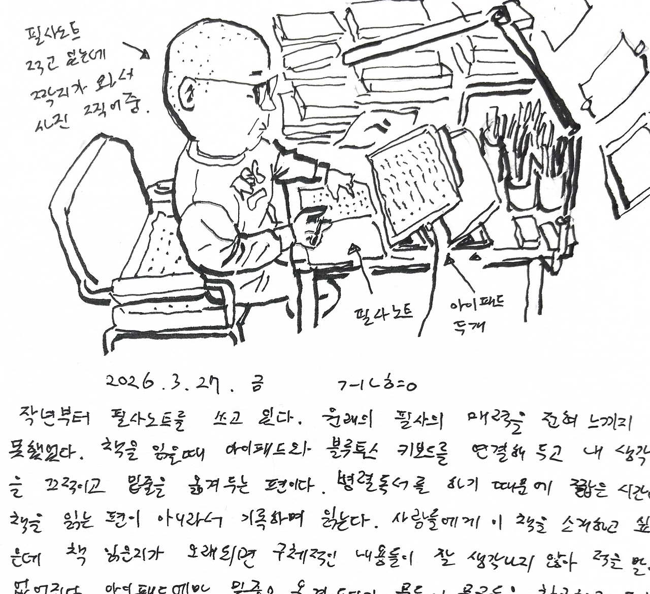 작년부터 필사노트를 쓰고 있다. 원래 필사의 매력을 전혀 느끼지 못했었다. 책을 읽을때 아이패드와 블루투스 키보드를 연결해 두고 내생각을 끄적이고 밑줄을 옮겨두는 편이다. 병렬독서를 하기 때문에 짧은 시간에 책을 읽는 편이 아니라서 기록하며 읽는다. 사람들에게 이 책을 소개하고 싶은데 책 읽은지가 오래되면 구체적인 내용들이 잘 생각나지 않아 적을 말이 없어진다. 아이패드에만 밑줄을 옮겨두다가 문득 이 문구들을 차곡차곡 모아두어야 겠다는 생각이 들었다. 그림일기 노트를 여섯권째(만 2년이 넘었다)써오니 물성으로서의 만족감과 뿌듯함을 경험했고, 그림일기노트처럼 필사노트에 책을 읽으며 내게 와닿은 구절을 손으로 옭겨 모아두면 좋겠다 싶었다. 공부삼아 시간이 날때 그 문구들을 다시 읽어봐도 좋을 것 같고 혹시 독서노트 류의 책을 쓸 기회가 생길지 또 모르지 않나. 글씨체가 이쁘지도 않고 손으로 옮겨적는게 시간도 오래 걸리고 번거롭지만 천천히 기록하고 쌓아가는 느낌이 좋다. 느린 기록의 의미.