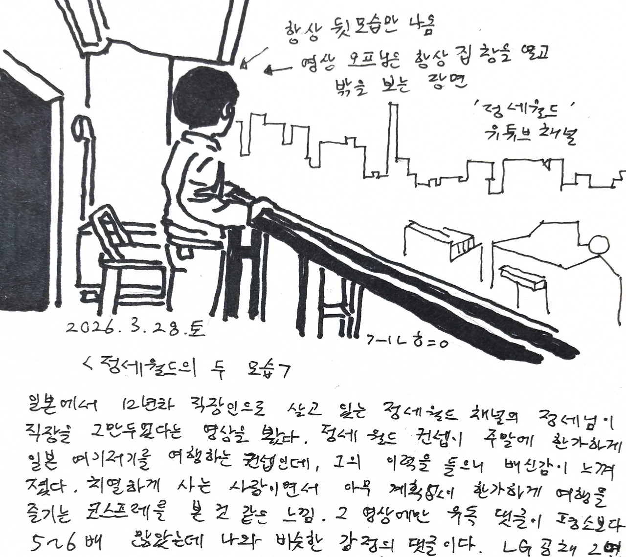 일본에서 12년차 직장인으로 살고 있는 정세월드 채널의 정세님이 직장을 그만두었다는 영상을 봤다. 정세월드 컨셉이 주말에 한가하게 일본 여기저기를 여행하는 컨셉인데, 그의 이력을 들으니 배신감이 느껴졌다. 치열하게 사는 사람이면서 아무 계획없이 한가하게 여행을 즐기는 코스프레를 본 것 같은 느낌. 그 영상에만 유독 댓글이 평소보다 5~6배 많았는데 나와 비슷한 감정의 댓글이다. LG공채 2연속 합격자이자 네이버 라인의 일본진출 기획자이자 기업가치 1조 일본 유니콘 기업 PM이자 배달의 민족 일본법인을 거쳐 오늘의 집 일본지사 법인장까지.(어느 구독자의 댓글 옮김) 이제는 그의 여행 영상을 봐도 뭔가 위선 처럼 느껴져서 보다가 꺼버리게 된다. 그래서 구독자도 20만이 넘다가 18만이 된 것 같다. 뭘하든 일본에서 열심히 잘 살아갈 사람이겠지만 나와는 삶의 방향성이나 결이 다른 사람으로 인식되어 흥미가 많이 떨어져 버렸다. 정세님에게 살아감에 있어서 중요한 것은 무엇일까 문득 궁금해진다.