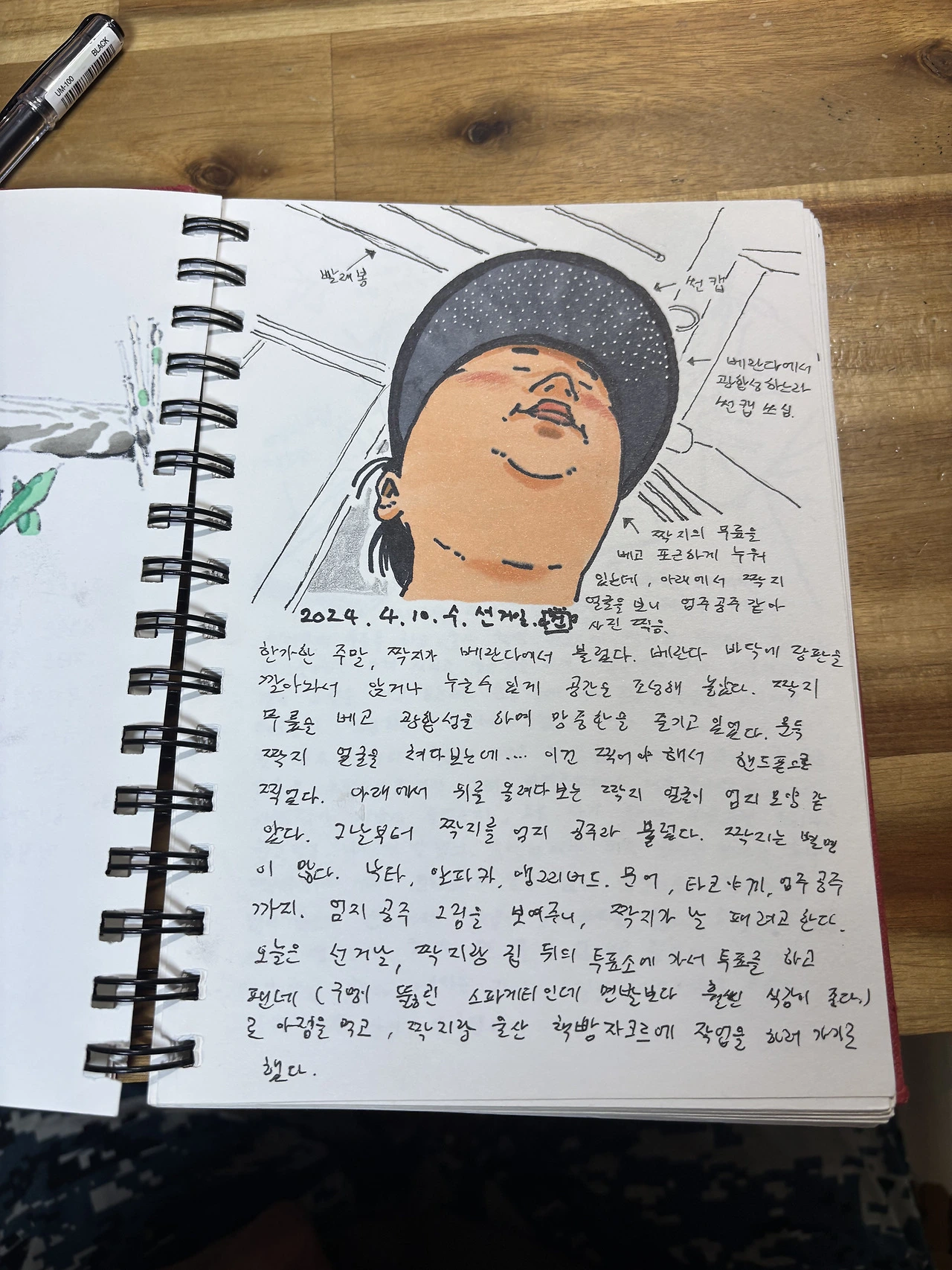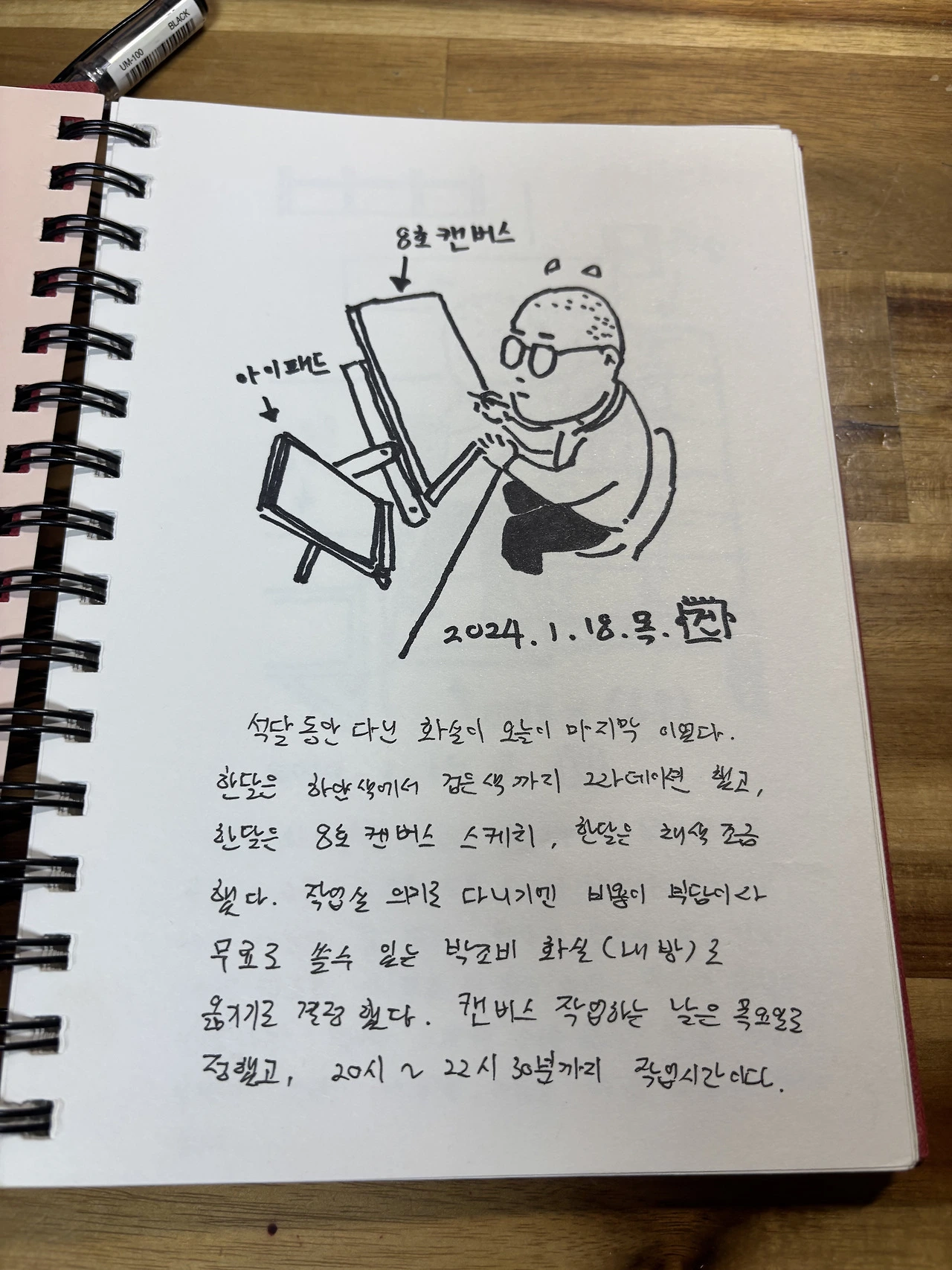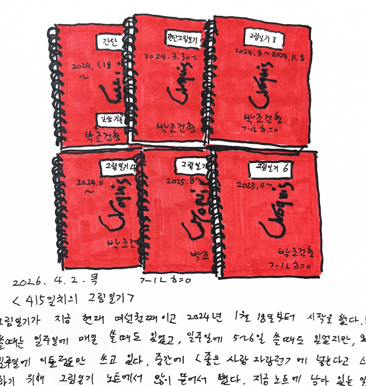 그림일기가 지금 현재 여섯권째이고 2024년 1월 18일부터 시작을 했다. 많이 쓸때는 일주일에 매일 쓸때도 있었고, 일주일에 5~6일 쓸때도 있었지만, 요즘은 일주일에 이틀정도만 쓰고 있다. 중간에 <좋은 사람 자랑전>에 넣는다고 스캔하기 위해 그림일기 노트에서 많이 뜯어서 뺐다. 지금 노트에 남아 있는 일기가 몇일치 인지 셀라 봤다. 총 415일치의 그림일기를 그려왔다. 처음에는 정말 그림일기처럼 그림도 단순하고 일기량도 그리 길지 않았다. 세권째 부터는 지금 스타일이 정해진것 같은데, 글이 많아졌다. 그림일기를 했다는 나만의 만족이라면 그림이 주인 그림일기여도 되지만, 그 그림이 무슨 내용인지 충분히 설명을 일기로 적어야 내가 하고자 하는 메세지를 전달할 수 있는 것 같아서 그림일기 치고는 글이 많은 편이다. 그림일기만으로 묶인 책을 내고 싶은 마음에 올해 말이나 내년쯤에 수십군데의 출판사에 출판의뢰 메일을 보내볼 생각이다. 되면 좋고, 안되면 말고. 안되면 여전히 그림일기를 쓰면 되고.