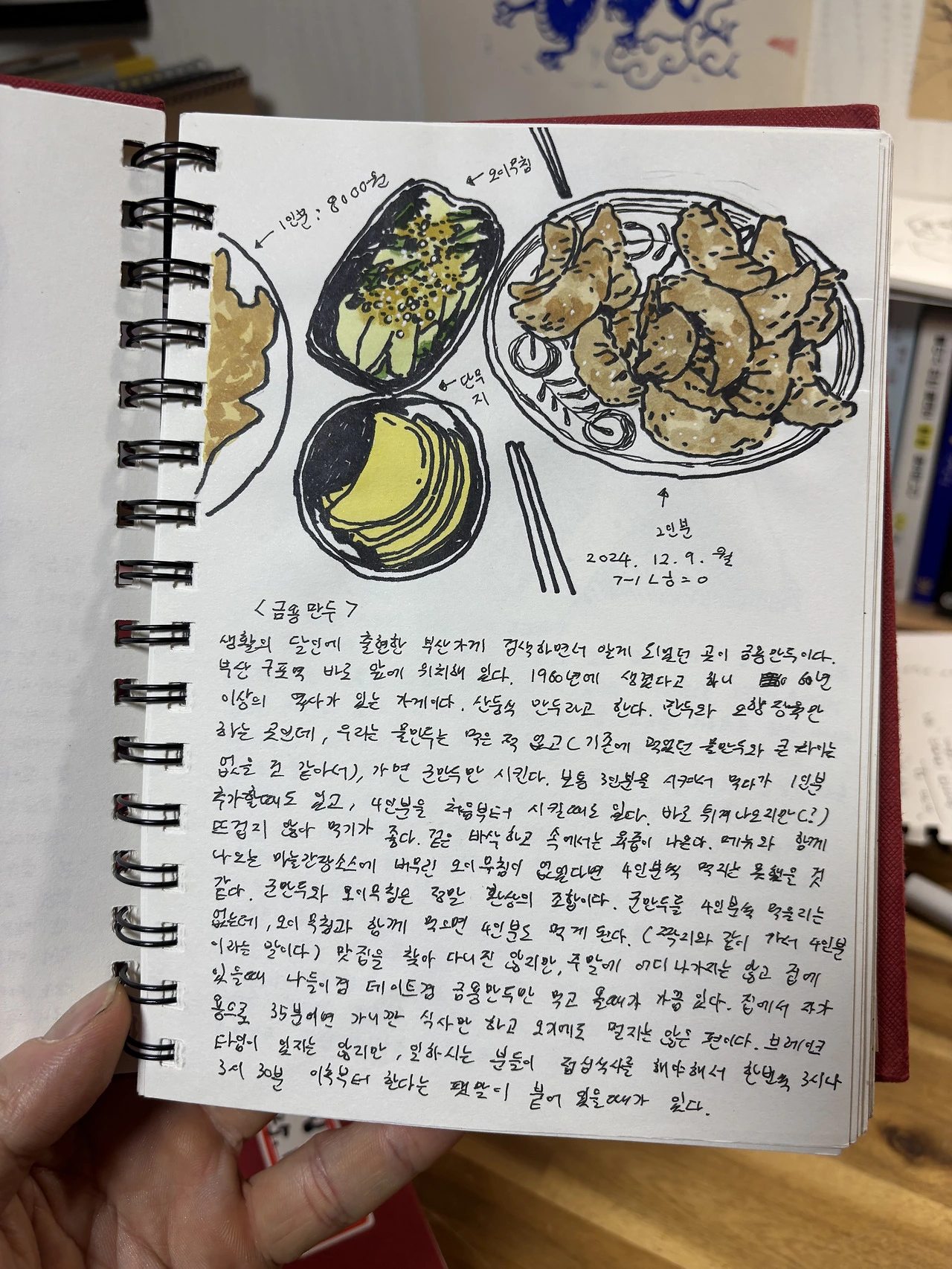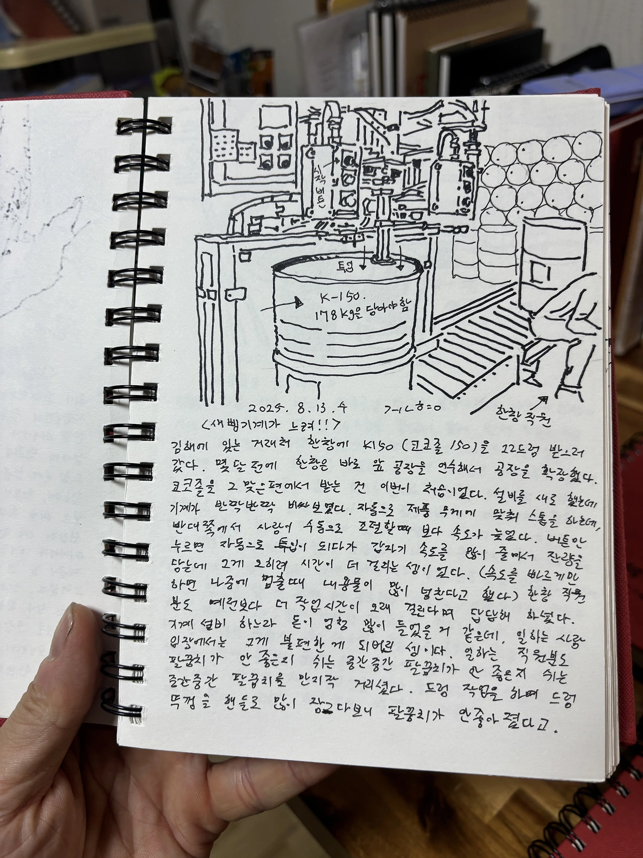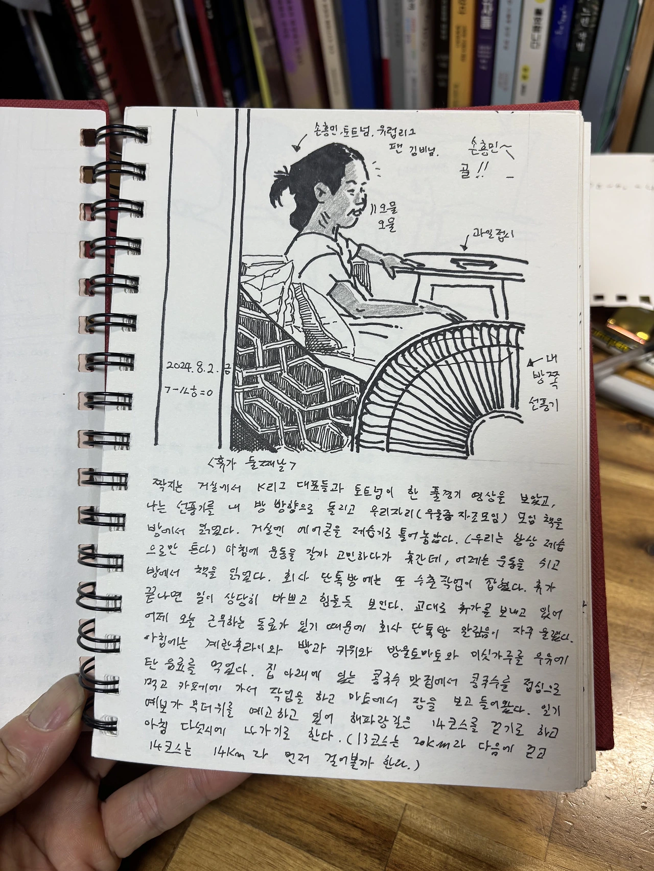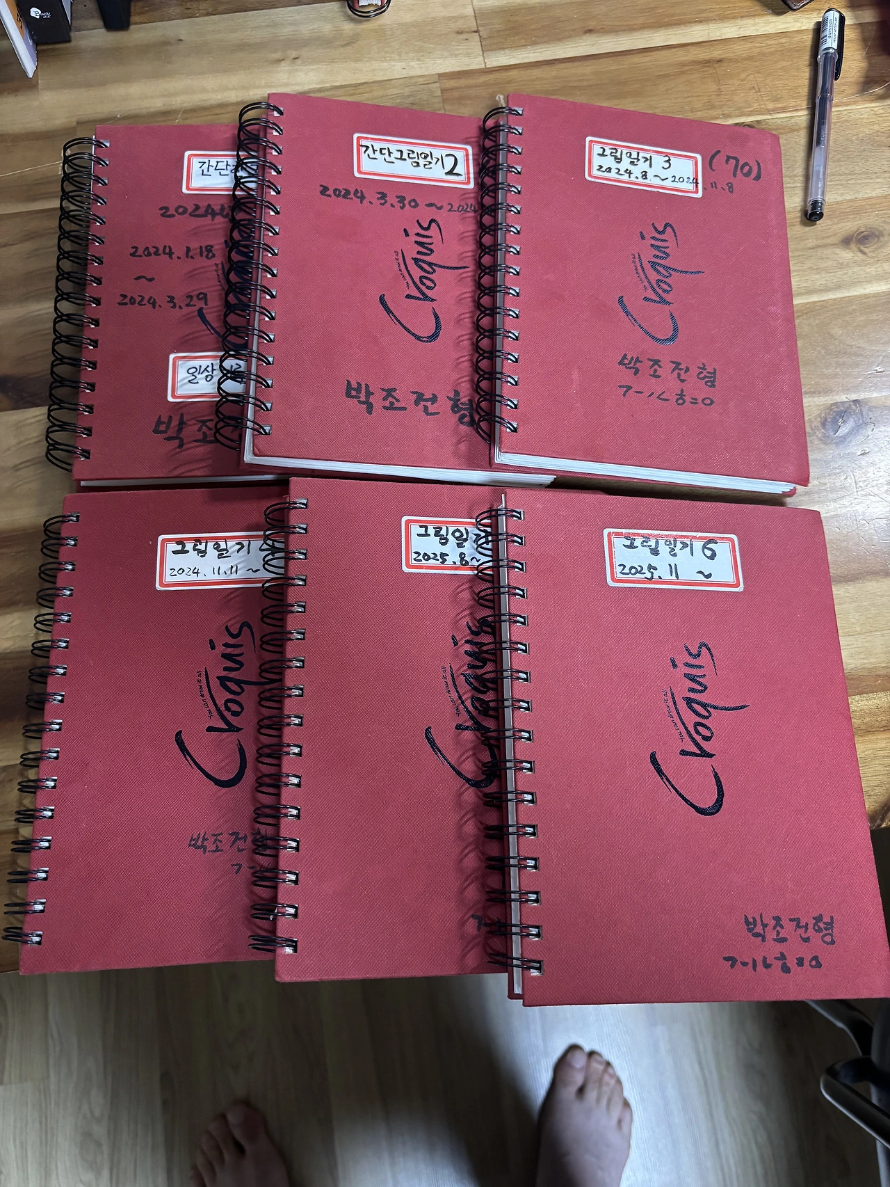 그림일기가 지금 현재 여섯권째이고 2024년 1월 18일부터 시작을 했다. 많이 쓸때는 일주일에 매일 쓸때도 있었고, 일주일에 5~6일 쓸때도 있었지만, 요즘은 일주일에 이틀정도만 쓰고 있다. 중간에 <좋은 사람 자랑전>에 넣는다고 스캔하기 위해 그림일기 노트에서 많이 뜯어서 뺐다. 지금 노트에 남아 있는 일기가 몇일치 인지 셀라 봤다. 총 415일치의 그림일기를 그려왔다. 처음에는 정말 그림일기처럼 그림도 단순하고 일기량도 그리 길지 않았다. 세권째 부터는 지금 스타일이 정해진것 같은데, 글이 많아졌다. 그림일기를 했다는 나만의 만족이라면 그림이 주인 그림일기여도 되지만, 그 그림이 무슨 내용인지 충분히 설명을 일기로 적어야 내가 하고자 하는 메세지를 전달할 수 있는 것 같아서 그림일기 치고는 글이 많은 편이다. 그림일기만으로 묶인 책을 내고 싶은 마음에 올해 말이나 내년쯤에 수십군데의 출판사에 출판의뢰 메일을 보내볼 생각이다. 되면 좋고, 안되면 말고. 안되면 여전히 그림일기를 쓰면 되고.