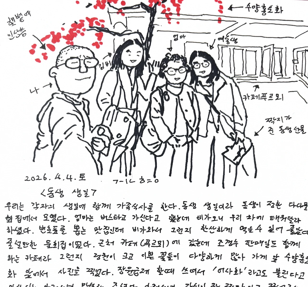 우리는 각자의 생일에 함께 가족식사를 한다. 동생 생일이라 동생이 정한 다다물회집에서 모였다. 엄마는 버스타고 가신다고 하셨는데 비가오니 우리 차에 태워달라 하셨다. 번호표를 뽑는 맛집인데 비가와서 그런지 한산하게 먹을수 있어 좋았다. 줄설만한 물회집이었다. 근처 카페(푸르뫼)에 갔는데 조경수 판매일도 함께 하는 카페라 그런지 정원이 크고 이쁜 꽃들이 다양하게 많아 가게 앞 수양홍도화 앞에서 사진을 찍었다. 장원급제 할때 쓰여서 ‘어사화’라고도 불린다고 일하시는 아저씨가 말씀해 주셨다. 아저씨가 자신이 잘 찍는다고 찍어주신다 했는데, 역시나 뒤 건물 배경까지 나오고 인물은 작게 나오는 옛날 스타일의 사진이었다. 각각의 나무마다 이름표가 걸려 있어서 좋았다. 동생은 평생 두번의 연애를 했다는 사실도 처음 알았다. 엄마는 치매예방을 위해 노인대학에서 영어수업을 들으시는데 원래 중급반을 또 들으려고 했는데 자리가 다 차서 어쩔수 없이 고급반을 신청했다고 했다. 수업 마치고 집에 오면 복습을 그렇게 열심히 하신다 했다. 짝지 청바지를 사는데 다 함께 유니클로에 갔고 영화 이야기가 나와서 우리집에가서 75인치 티비로 함께 영화를 봤다. 엄마는 CSI류의 범죄추리물을 좋아하고 동생은 이성민을 좋아한다 해서 2018년 영화인 목격자를 넷플릭스로 봤다. 2년전에 처음 가족식사를 할땐 식사하고 차한잔만 하고 헤어졌는데, 이제는 함께 긴 시간을 보내며 다양한 이야기를 나누는 가족 모습이 좀 더 편해져서 좋다.