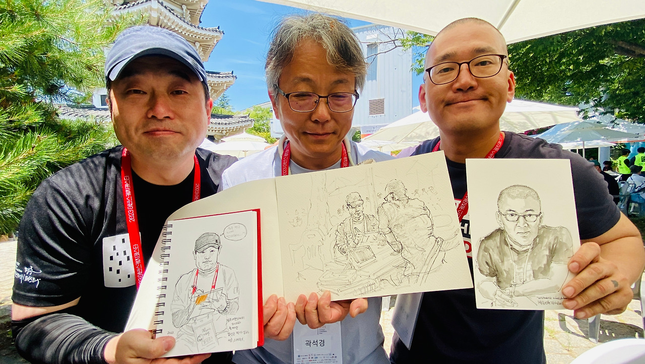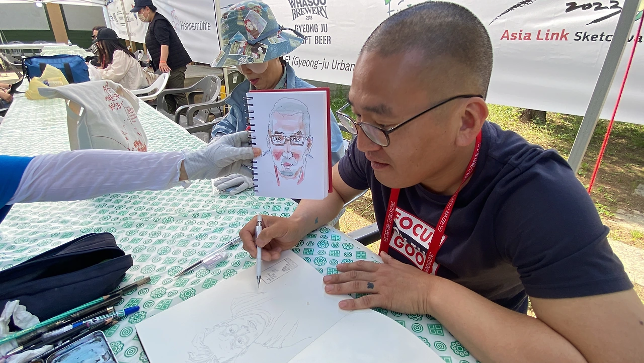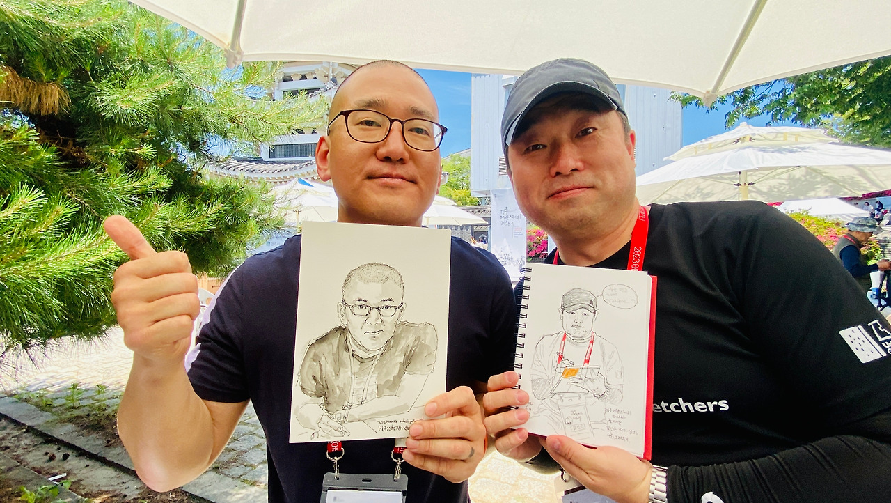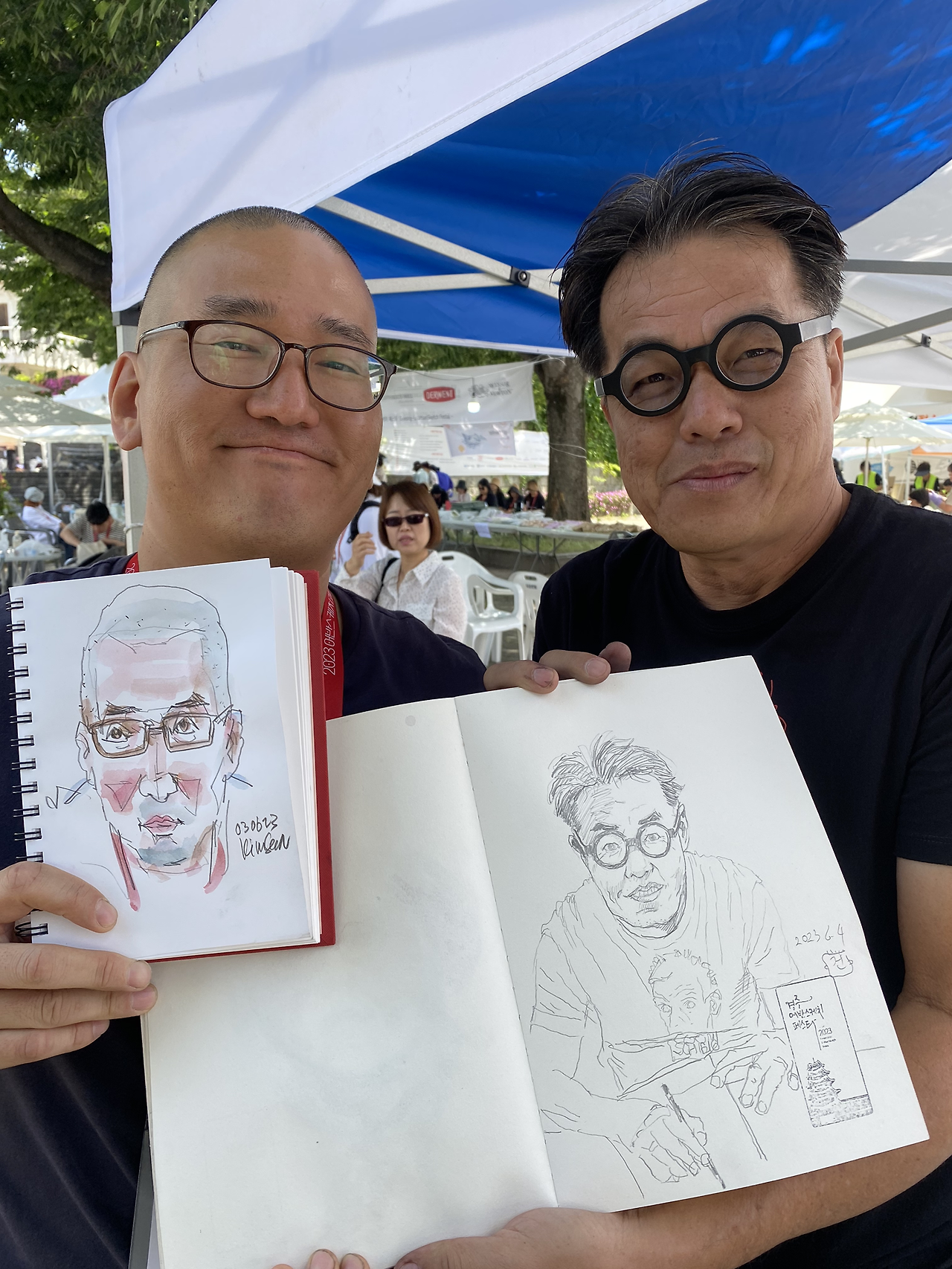 축제가 마무리 되고 정리가 되니 경주 페스타에 힘써주신 스텝분들이 내 부스에 많이 들려 그림도 구경하시고 내 작업물에 관심을 가져주시고 책도 많이 구매해 주셨다. 경주 어반스케쳐스 멤버들의 허락이 있다면, 앞으로 한달에 한번 정도 경주 어반스케치 모임에 참여를 할 생각을 했다. 스텝분들의 세심한 관찰과 정성과 땀으로 나는 이틀의 축제를 정말 최고로 행복하게 즐길수 있었기에 감사의 마음으로 혼심을 다해 자스민 님과 정동식 작가님 그림을 그려 선물로 드렸다.
