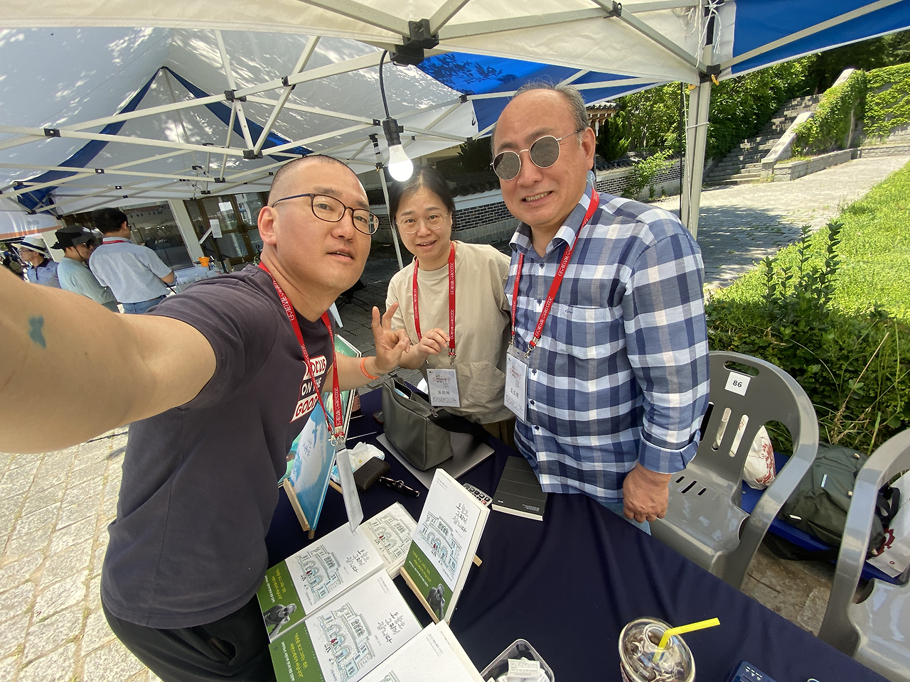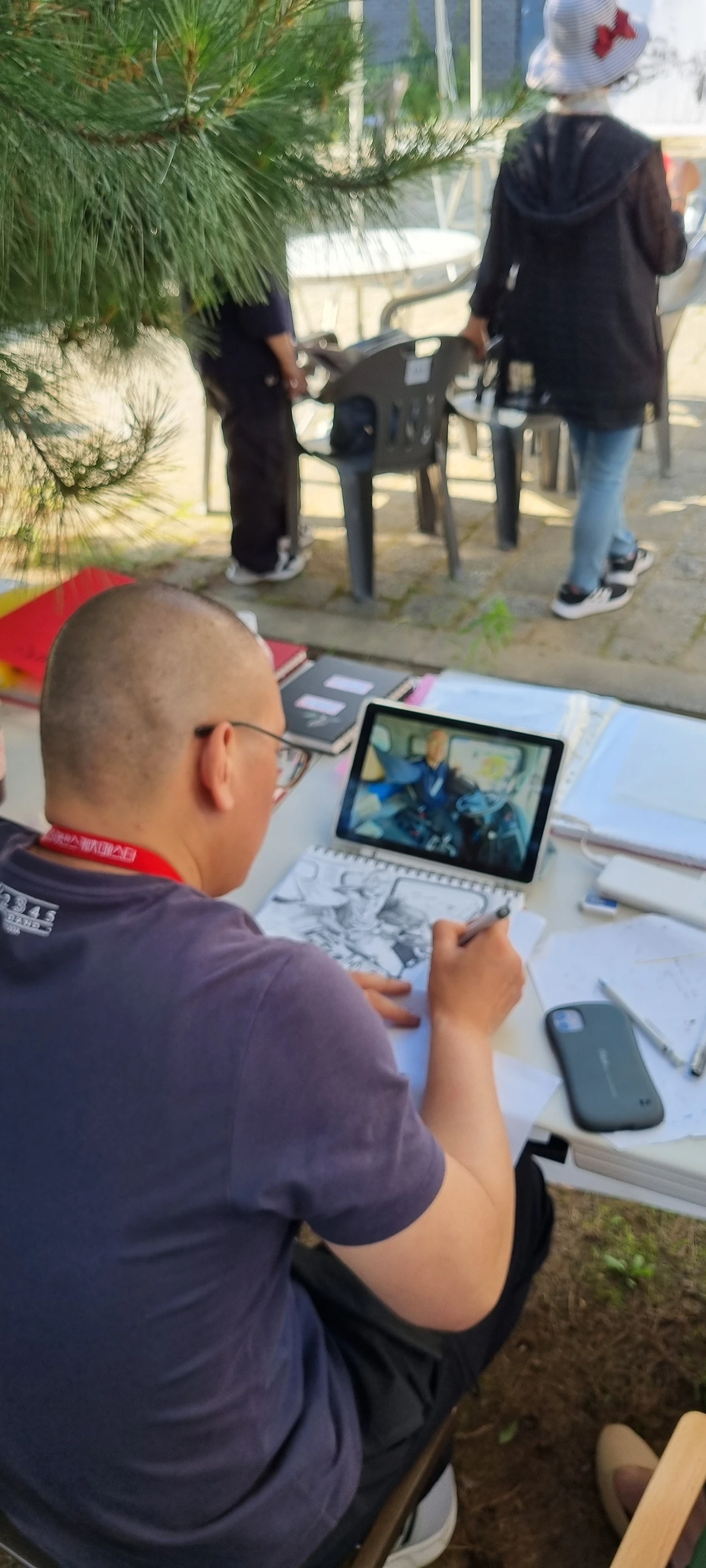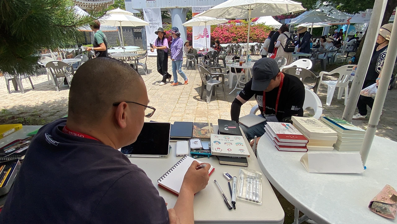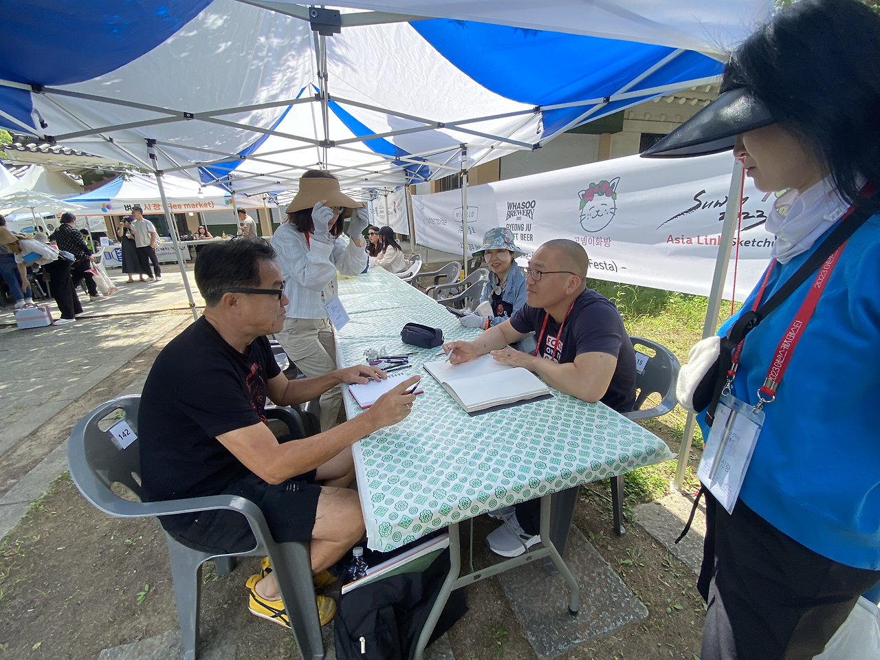 어제도 그렇고 오늘도 우리 부스뒤 그늘에서 충분한 휴식과 드로잉을 하신 나무향기님을 놓칠수 없지. ㅎㅎ 여러가지 수다도 떨고 함께 드로잉도 하고 참 감사했다. 예전에 서울에서 한번 나무향기 작가님의 수채화 수업도 듣고, 같이 밥 먹은적이 있었다.
