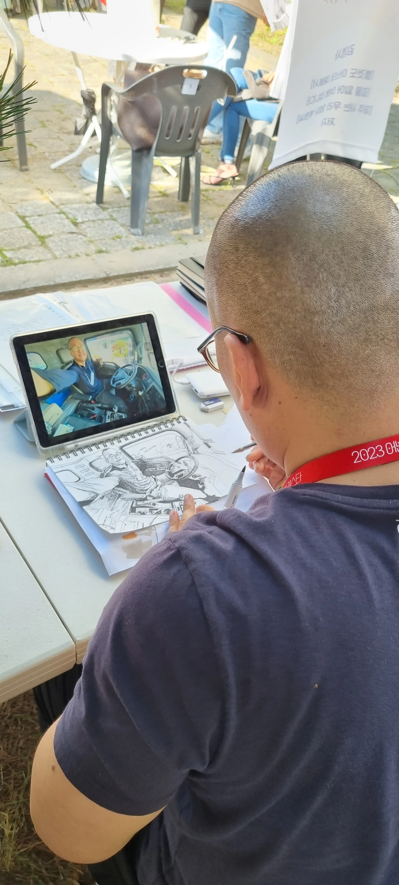 다시 제자리로 돌아와 그림을 그리고 있는데, 이번에는 또 김인근 작가님이 와서 라이브 드로잉을 제안하시는게 아닌가. 나는 혼쾌히 그 제안을 받아 이번에도 재미있게 그렸다. 이것도 자꾸 해보면, 다양한 재료들을 써보게 될 것 같았다. 김인근 작가님은 농담삼아 맥주마시면서 그려야 잘 그려진다고 하셨고 나는 그 말을 대사컷을 그림에 넣어 적었다.ㅎㅎ 김인근 작가님은 내가 지향하는 롤모델중의 한분이다. 인물, 풍경, 건물, 어반, 못하는게 없는 분이라 롤모델 삼아 즐겁게 그리려 한다.