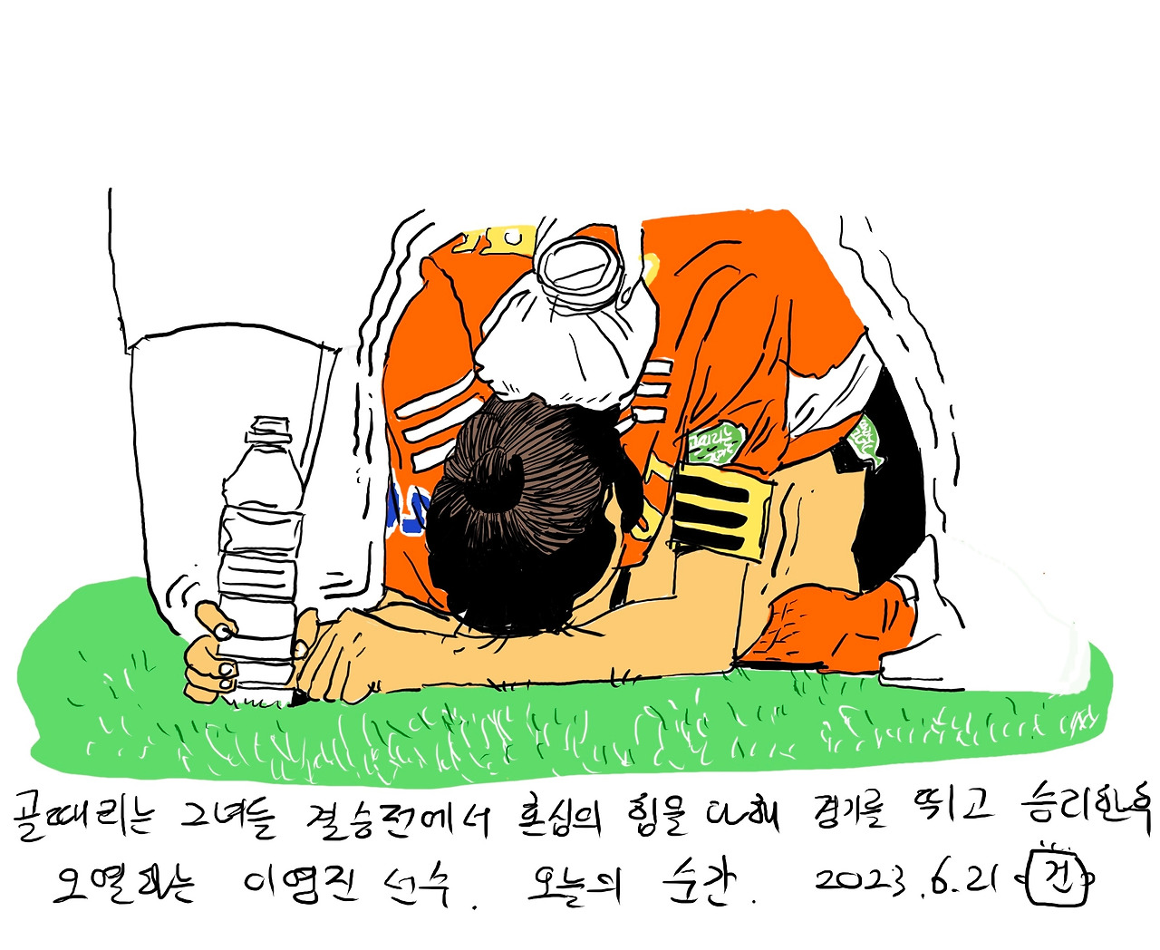 평소 즐겨보던 골때리는 그녀들. 오늘 액셔니스타와 월드클라쓰의 결승전이 있었다. 4대1 로 액셔니스타가 이기고 나자 이영진은 그자리에서 쓰러져 오열을 했다. 그리고 MVP에도 뽑혔다. 이영진 선수의 처음을 기억한다. 어슬프고 몸쓰는 것도 힘이 없던 선수. 그런데, 묵묵하게 성실히 노력을 해 온 결과, 경기에 큰 영향을 미치는 선수가 되었다. 평소 몸 움직이는 것을 정말 싫어했다고 한다. 그런데, 골때리는 그녀들을 만나고 나서 운동하지 않는 자신을 상상할 수 없어졌다고 한다. 놀라운 변화. 운동하는 여성은 멋지다. 혼신을 다해 싸운 액셔니스타와 월드클라쓰는 서로를 격려하고 상대방의 승리를 진심으로 축하해주었다. 얼마나 아름다운 동료애 인가. 운동하는 여성들이 많아지는 것은 참 멋진 일이다. 여성에게 프레임을 씌어 몸쓰는 것과 많이 멀어진 여성들이 얼마나 많은가. 운동을 해서 멍이 들고 찰과상을 입고, 근육이 생기고 그런 여성의 몸은 멋지고 아름답다. 미끈하고 늘씬한 몸만이 추앙받는 세상에서 골때리는 그녀들이 하는 역할은 참 크다. 오늘의 멋진 순간을 기록하고 싶어서, 아이패드를 켜고 짧게 드로잉으로 기록한다.