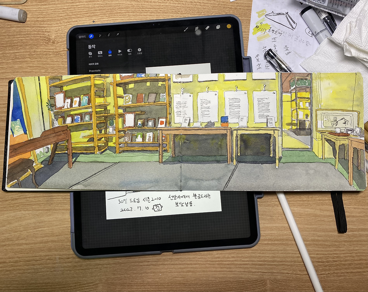 전시장 한쪽에 자리를 잡고 앉아 드로잉북을 펼쳤다. 긴 전시장의 풍경을 담고 싶어서 드로잉북 양쪽을 다 그리기로 했다. 한시간정도 그렸고, 모임 시간이 되어 1층 브라운핸즈 커피로 내려갔다. 그들과 함께 1시간 정도 서로의 그림을 구경하고 수다를 떨고 브라운핸즈 커피의 에어콘이 너무 추워 더 있을수가 없어 근처의 조용한 카페로 옮겨 그림을 그렸다. 아까 찍어두었던 사진을 아이패드에 띄워 천천히 수채화 채색했다. 현장스케치에 한시간, 채색에 두시간 걸렸다. 어반스케치 경험이 적다보니 나는 그냥 내속도 대로 천천히 하기로 했다. 그림의 결과는 무지 마음에 들었다. 김병휘작가님의 밝은 곳은 노란색을 시원하게 쓰라는 말에 힌트를 얻어 그렇게 채색한 것도 마음에 들었다.
