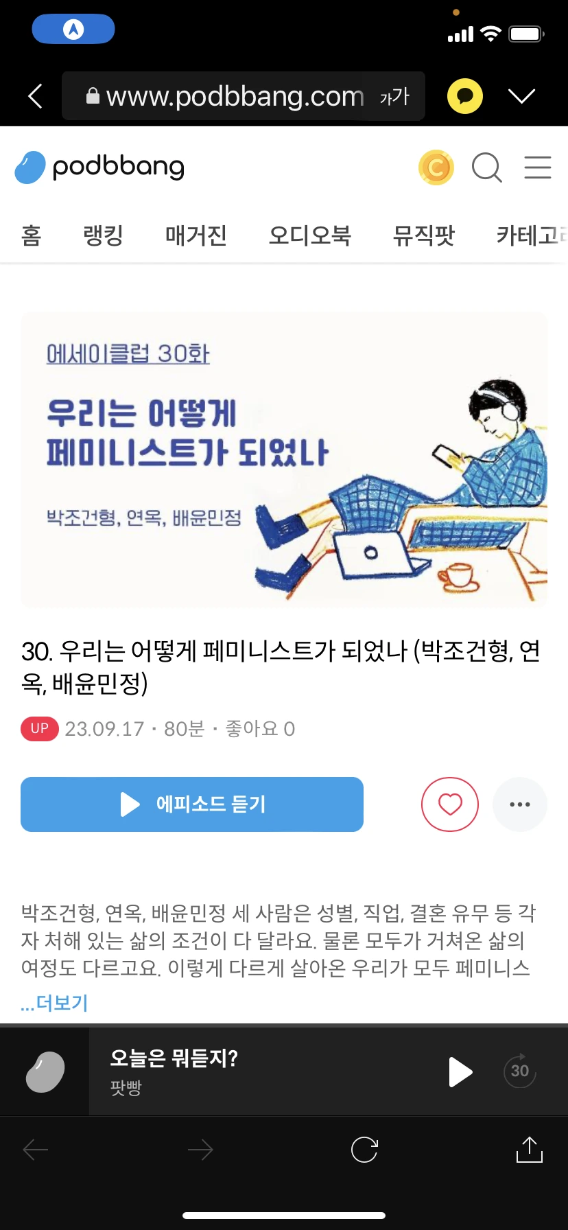 에세이클럽 30화에 게스트로 초대되어 녹음했습니다. “우리는 어떻게 페미