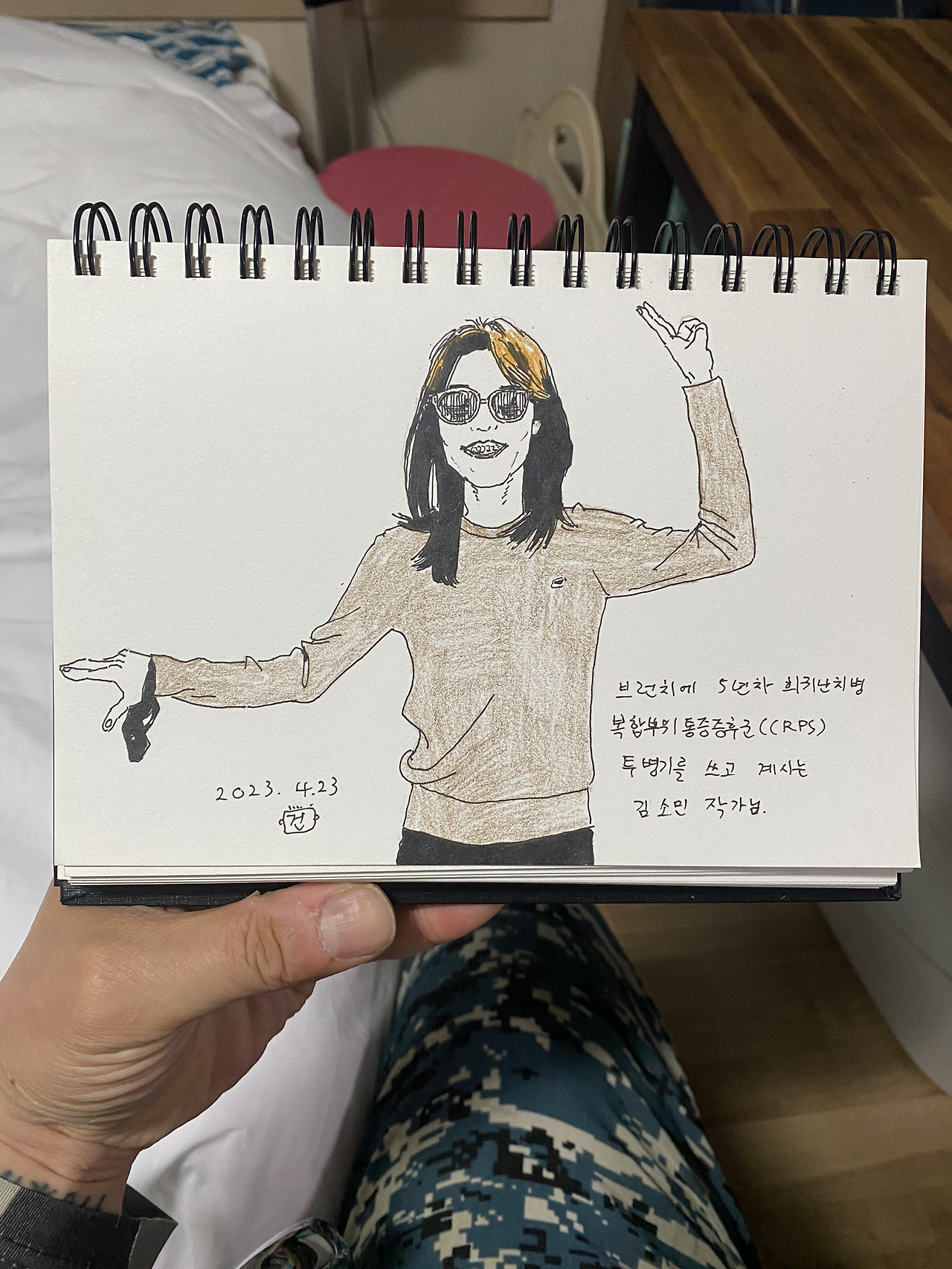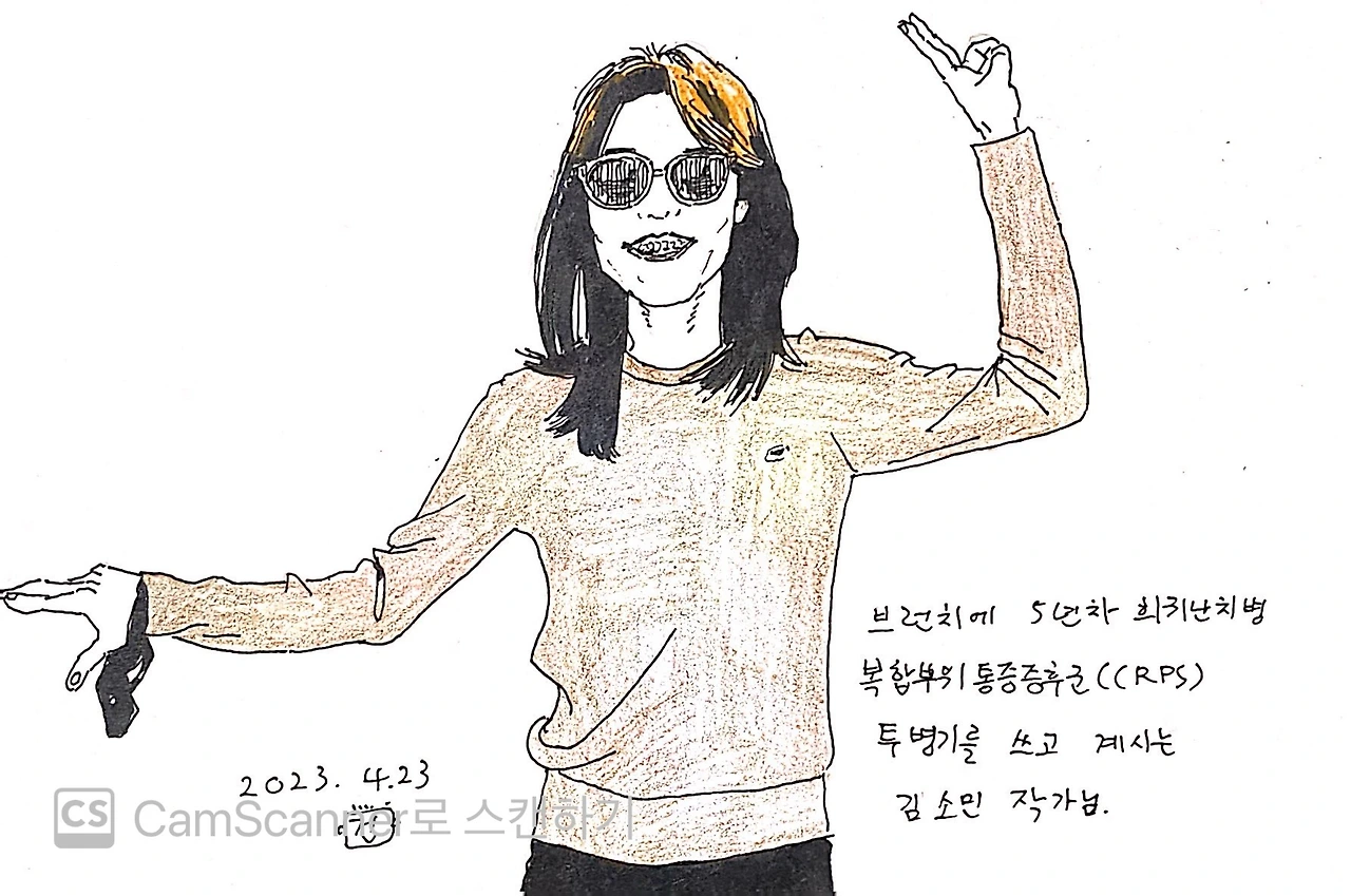 우연히 브런치에서 작가님의 글을 읽고 처음부터 정주행해서 14편 까지 읽었다. 어느날 갑자기 자신에게 날아온 CRPS라는 엄청난 질병. 그 투병기를 읽는데 내 마음도 너무 아팠다. 우울증때문에 죽음을 생각한 적이 많기도 하지만, CRPS라는 난치병에 비할바 못되었다. 5년이라는 긴 시간을 어떻게 감내하며 지내오셨을지. 그럼에도 불구하고 자신의 투병기를 기록하시는 모습이 멋지다고 생각하고 작가님의 팬이 되었다. 독자의 한 명으로써 작가님에게 작은 마음이라도 전하고 싶어, 작가님에게 사진을 얻어 간단히 펜드로잉을 그려보았다. 혜안이 있는 편집자가 작가님의 글을 보고 출판해 보자고 꼭 제안을 해주셨으면 좋겠다. 힘든 투병기의 과정에 있는 당사자가 매주 한편의 글을 써내려가기란 쉽지 않을 것이다. 그럼에도 규칙적으로 글을 쓰려고 애쓰시는 작가님을 멀리서 응원하고 싶다.