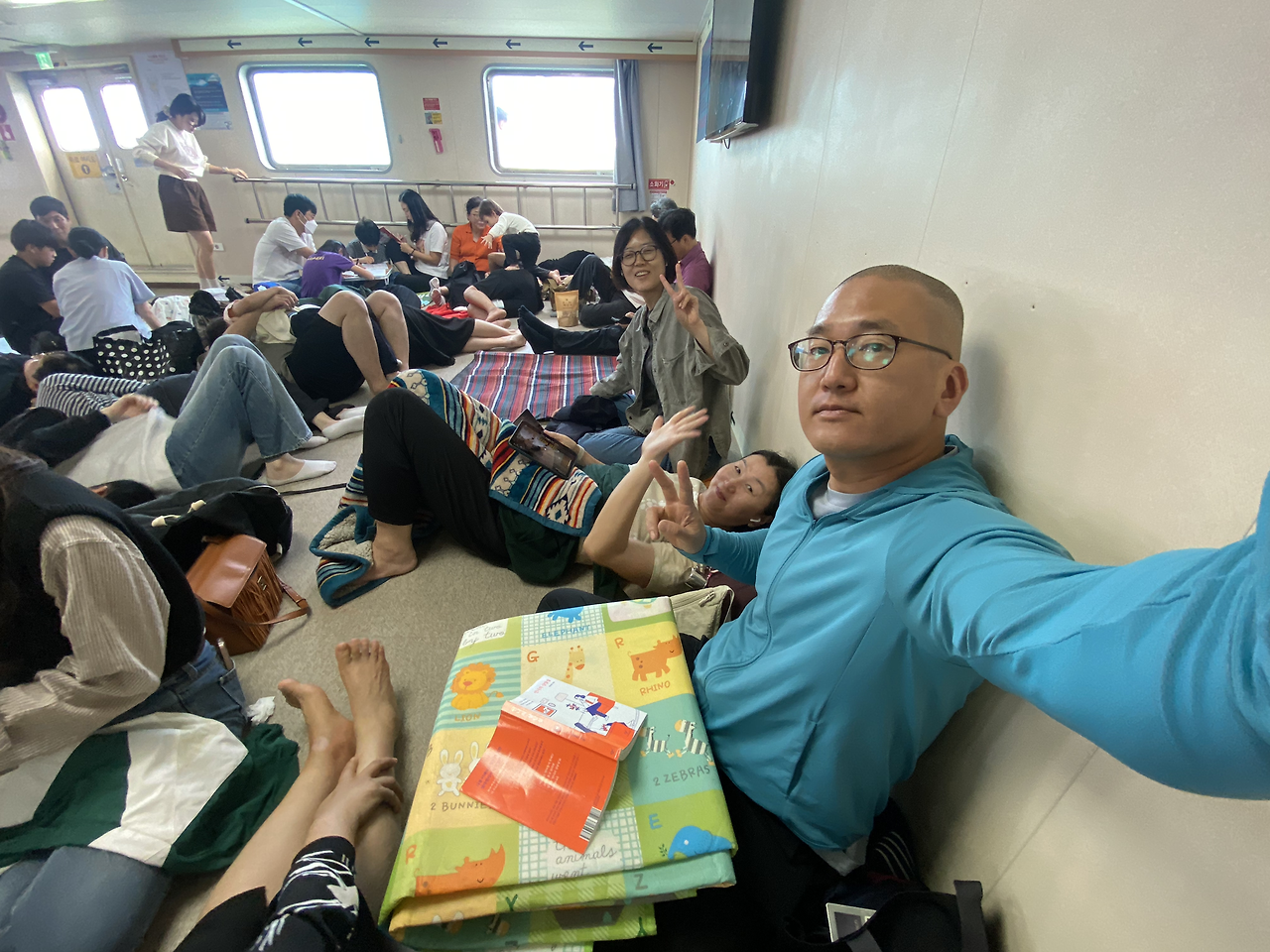 연휴 전날 부산에 사는 설헤씨가 양산으로 와서 함께 잠을 잤다. 새벽 2:40에 일어나서 준비하고 3:20에 녹동항으로 출발을 했다. 자주 짝지랑 다니던 길이었지만, 일행이 한 명 늘어나니 가는 길이 멀지 않게 느껴졌다. 06:50에 녹동항 도착. 연휴첫날이라 녹동항에는 사람이 엄청 많았고, 배를 실는데도 오랜시간이 걸렸다. 눈치 빠른 김비님이 앞쪽에 줄을 서서 배에 빨리 입장을 할 수 있었고, 우리는 3등실 벽쪽 자리를 선점할 수 있었다.