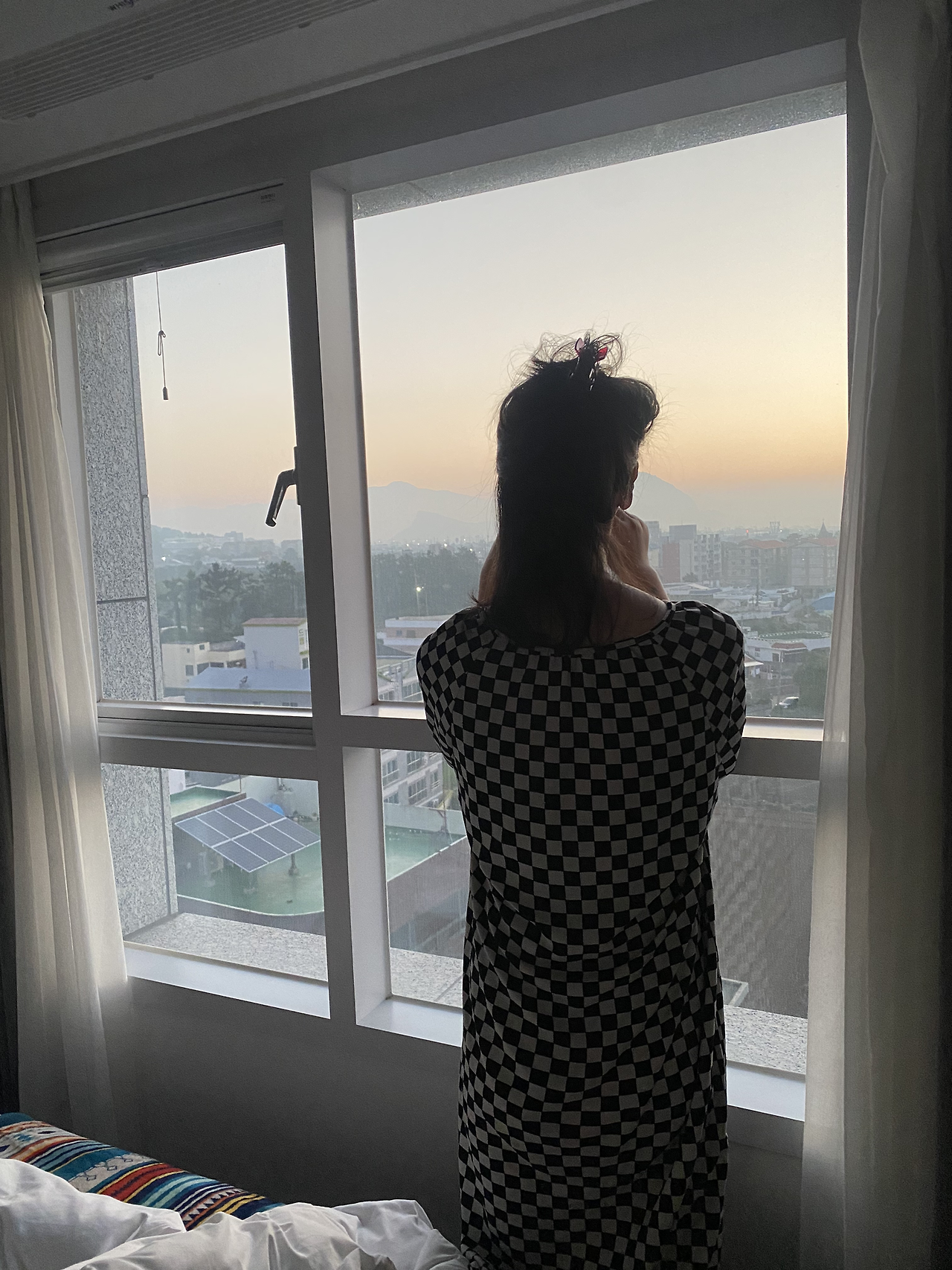 내일은 추석당일이라 고깃집이 여는 곳이 없을 것 같아서 오늘 고기를 먹자고 했다. 일단 숙소에 가서 짝지가 좀 눕고 체력을 회복하면 그때 저녁을 어떻게 할지 생각하기로 했다. 설혜씨가 모슬포 쪽에 예약한 호텔(호텔 케니 모슬포)이 가성비 최고의 숙소여서 너무 맘에 들었다. 우리는 2박에 2인 투베드 룸이 113,000원이라 이름만 호텔이지 모텔을 개조한 숙소라 생각했는데, 너무 깔끔하고 8층 창밖으론 한라산, 단산, 산방산이 다 보이는 멋진 뷰의 위치가 아닌가. 숙소에 들어오자 마자 짝지는 침대에 뻣었고 나도 한숨 잤다.