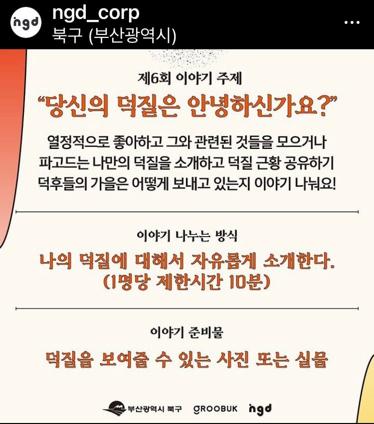 무언가를 좋아하는 감정은 삶을 살아가는데 큰 힘이 된다. 무엇을 좋아할수 있다는 것도 어떻게 보면 좋은 능력이다. 나이가들어 덕질을 하는 사람들을 한심하게 바라보는 사회적 시선이 있지만, 서로의 다른 관심사를 경청하는 문화를 자꾸 경험하다보면 자신의 취향과 덕질에 소신을 가지고 오래 좋아할 수 있게 되리라 믿는다. 엔디지 대표 박성은님의 진행으로 좋은 시간을 가졌다. 7회 마지막 모임은 7월 15일 수요일 19시, 화명역(기차역) 2층 공간에서 한다. 관심있는 분들은 엔지디 인스타에서 공지뜨면 신청해 주시면 됩니다.