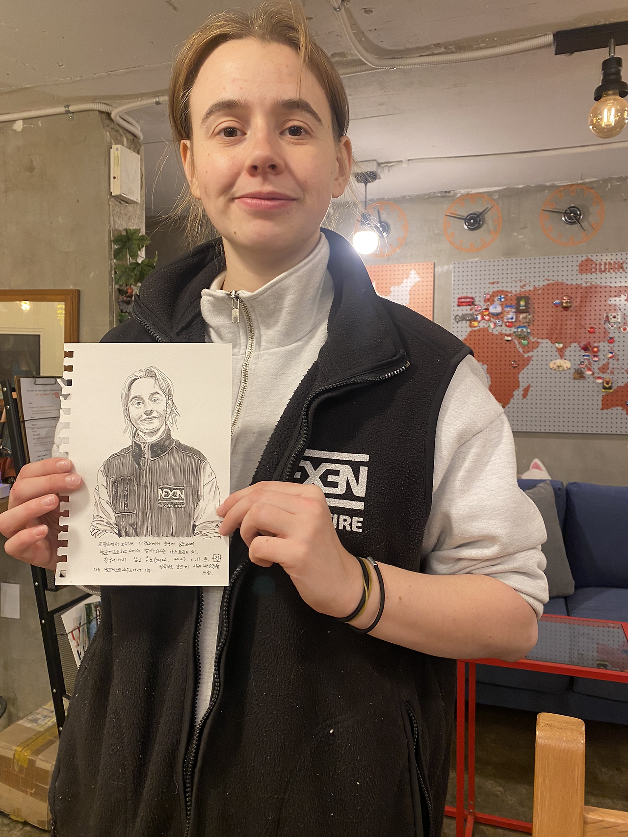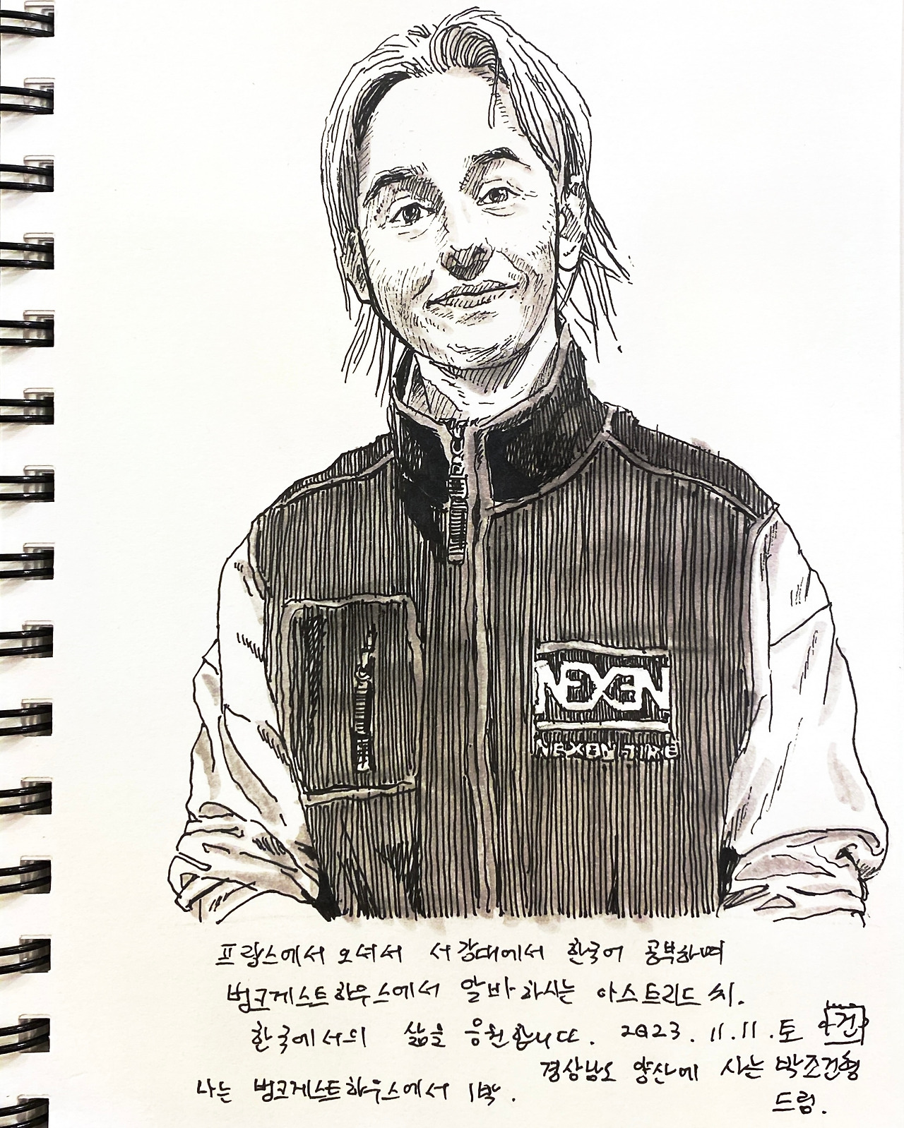 10시 퇴근이라 하셔서 가시기전에 선물을 드리고 싶어서 사진을 찍어 그려드려도 되나 여쭙고 그림을 집중적으로 짧게 그렸다. 프랑스에서는 엔지니어를 전공하셨는데, 서강대에 다니며 한국어를 배우고, 게스트하우스에서 알바를 하시는 것 같았다. 한국에서 살아볼려고 오셨다고. 오신지 2년째. 멀리 타지에서 타국의 언어를 배우며 사시는 삶을 응원하고 싶어 그림을 그려 선물해 드렸다.