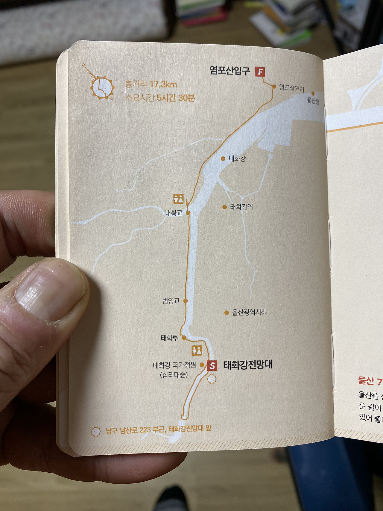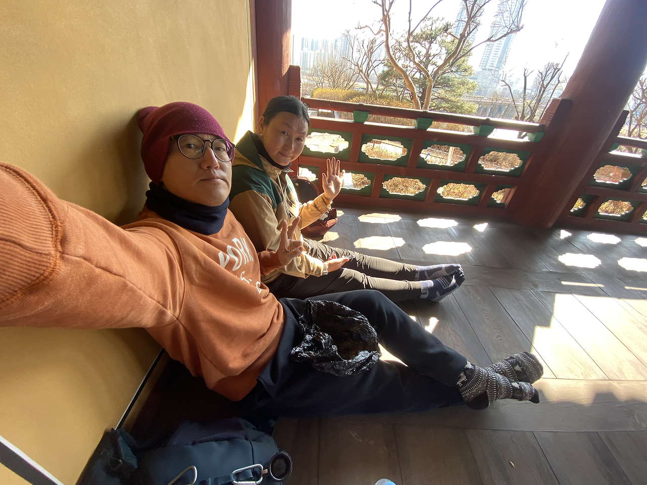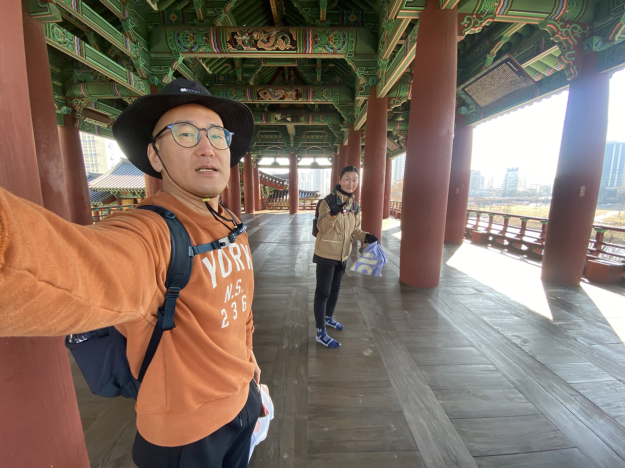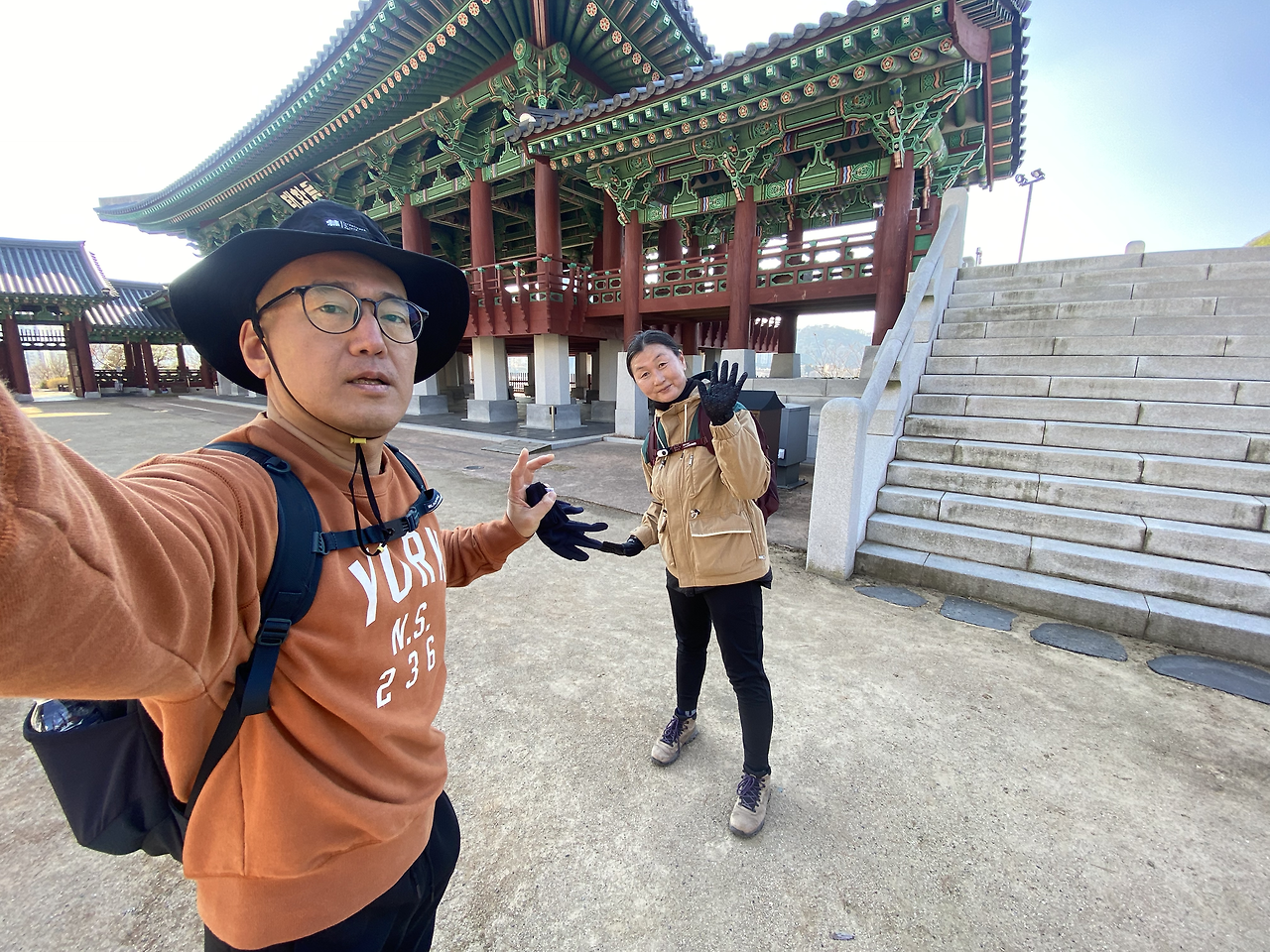 첫번째 쉰 곳은 태화루. 신발주머니가 있어 신발을 주머니에 넣어 양말신고 올라가 간단히 쉬었다. 두번째 쉰곳은 정주영의 호가 아산이라는데, 아산로에서 쉬었다. 아산로 주변은 수출하는 현대 차들이 좌우로 칼각으로 주차되어 있는데, 그걸보는 것도 장관이었다. 대체 이많은 차들을 누가 타고, 이렇게 많이 생산해 내는 것이 영원하지는 않을 것인데…하는 생각도 했다. 전기자동차 생산 공장을 짓는 공사장도 지났다. 아산로 길은 걷기에는 좋지 않았다. 길은 좁은데, 자전거 타고 지나가시는 분들도 많아서 한쪽에 붙어서 갔다.