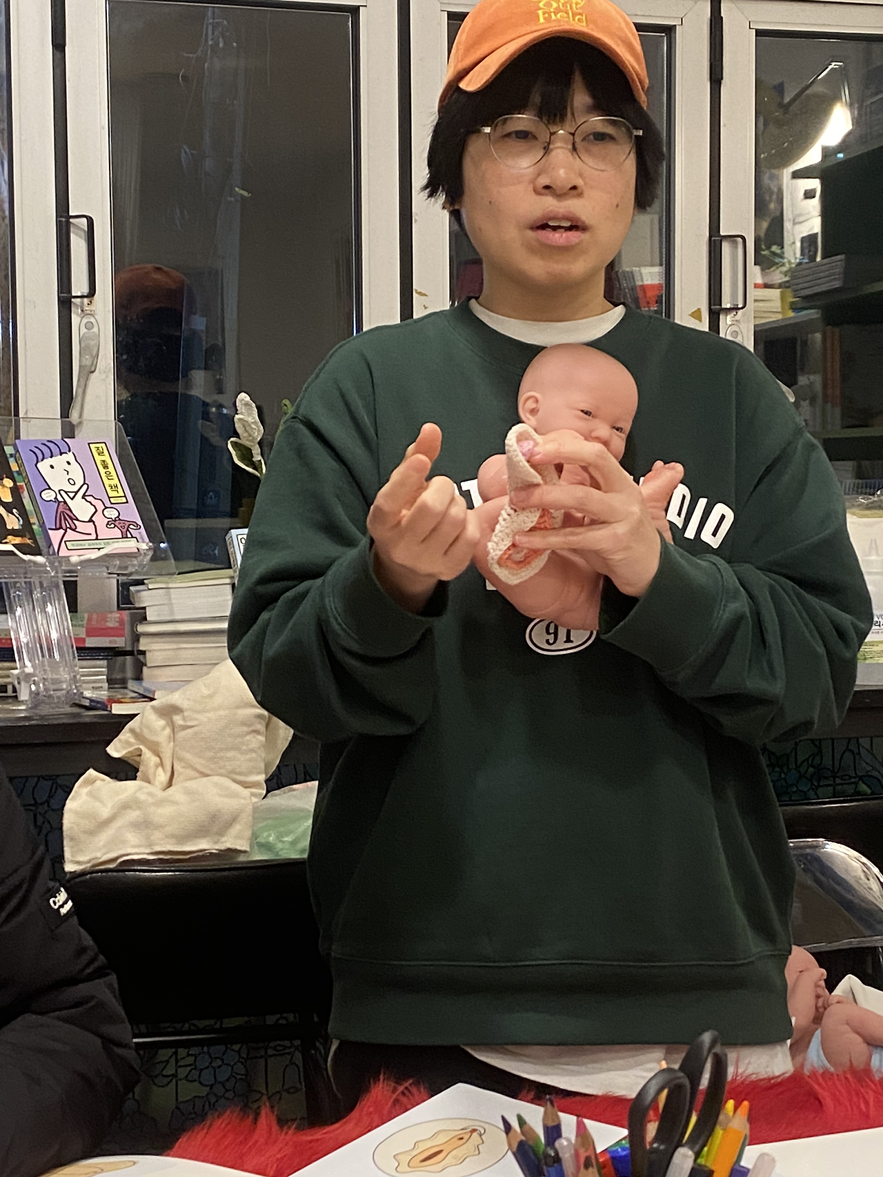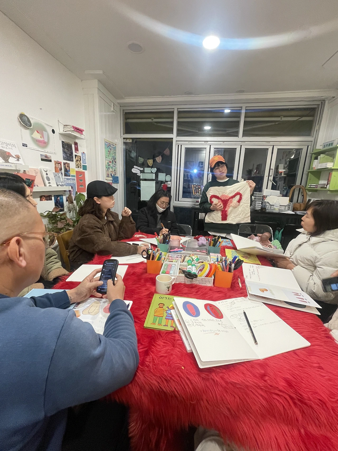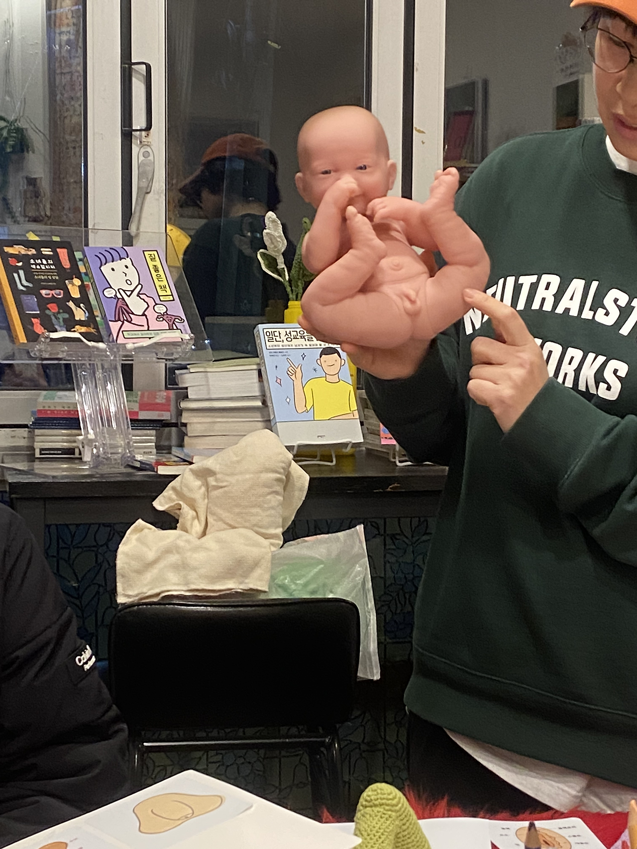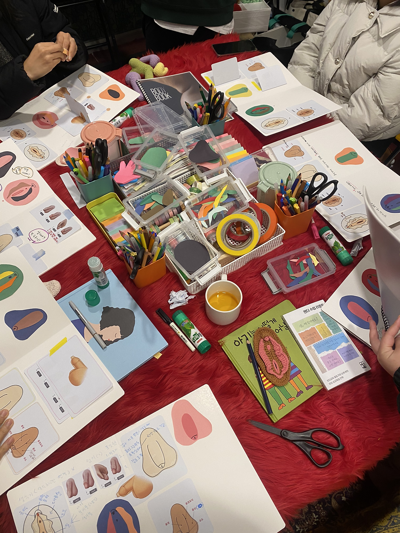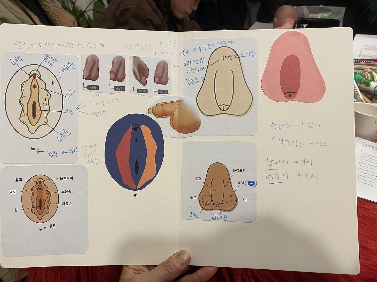 수업은 아이들을 대상으로 하는 프로그램을 그대로 우리가 체험하게 해주셨고, 부모들에게 설명해주는 내용을 우리에게 들려주셨다. 오리고 붙이고 만지고 하느라 시간가는줄 모르고 수업에 집중했다. 그 자리에 오신 분들도 제대로 성교육을 받은 경험이 없으시기에 모르는 것들도 많이 배우고 재미 있어 하셨다. 성기 모형을 뜨게실로 주문제작해 만든 소품들은 귀여웠다. 성기의 명칭들을 붙이면서 만들어보니깐 머리에 더 쏙쏙 들어오고. 외국의 수업 자료들을 여러가지 챙겨오셨는데, 정말 다양한 색과 모양의 벗은 몸을 사진으로 찍은 자료북은 정말 우리나라에 필요한 자료집이 아닐까 생각이 되었다. 여성 성기 남성성기의 색깔과 크기도 다르고, 몸의 굴곡과 살집의 형태도 다 다르고, 몸에 장애가 있는 사람의 모습도 있고, 수술을 문신으로 덮은 몸의 모습도 있었다. 우리들도 마찬가지이고 아이들은 더욱더 정형화 되고 획일화된 늘씬한 몸만 보다보니 자신의 몸을 긍정하기 힘든 현실속에서 더욱더 필요한 수업과정이었다.